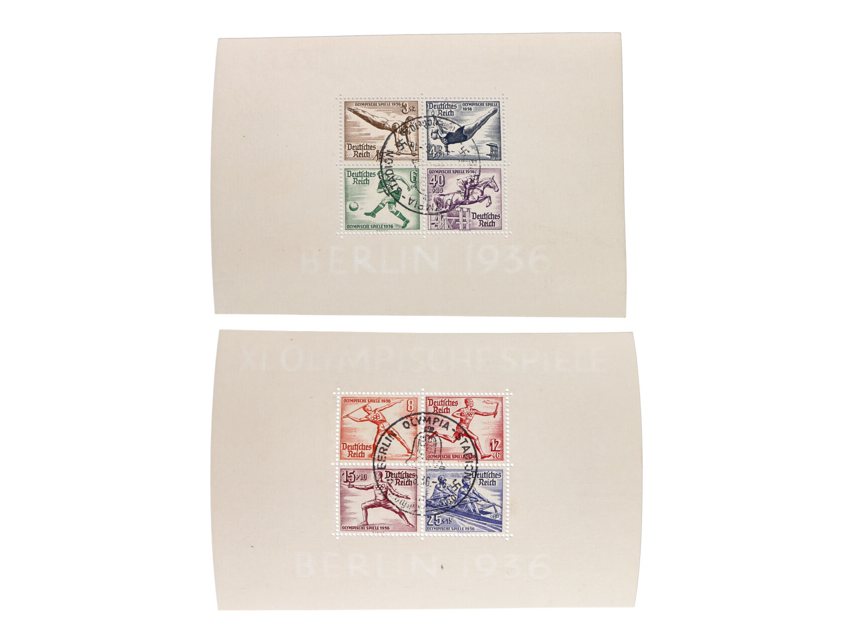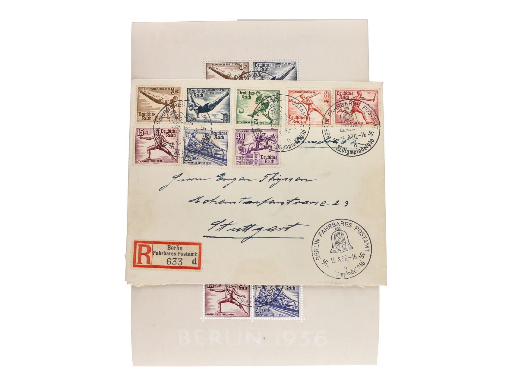 Bl. Mi. 5 + Bl. 6 s pam. olympyjským raz. a R-dopis do Stuttgartu frank zn. Mi. č. 609 - 616 s pod. raz. BERLIN FAHRBARES POSTAMT 15.8.36 + přích. raz.