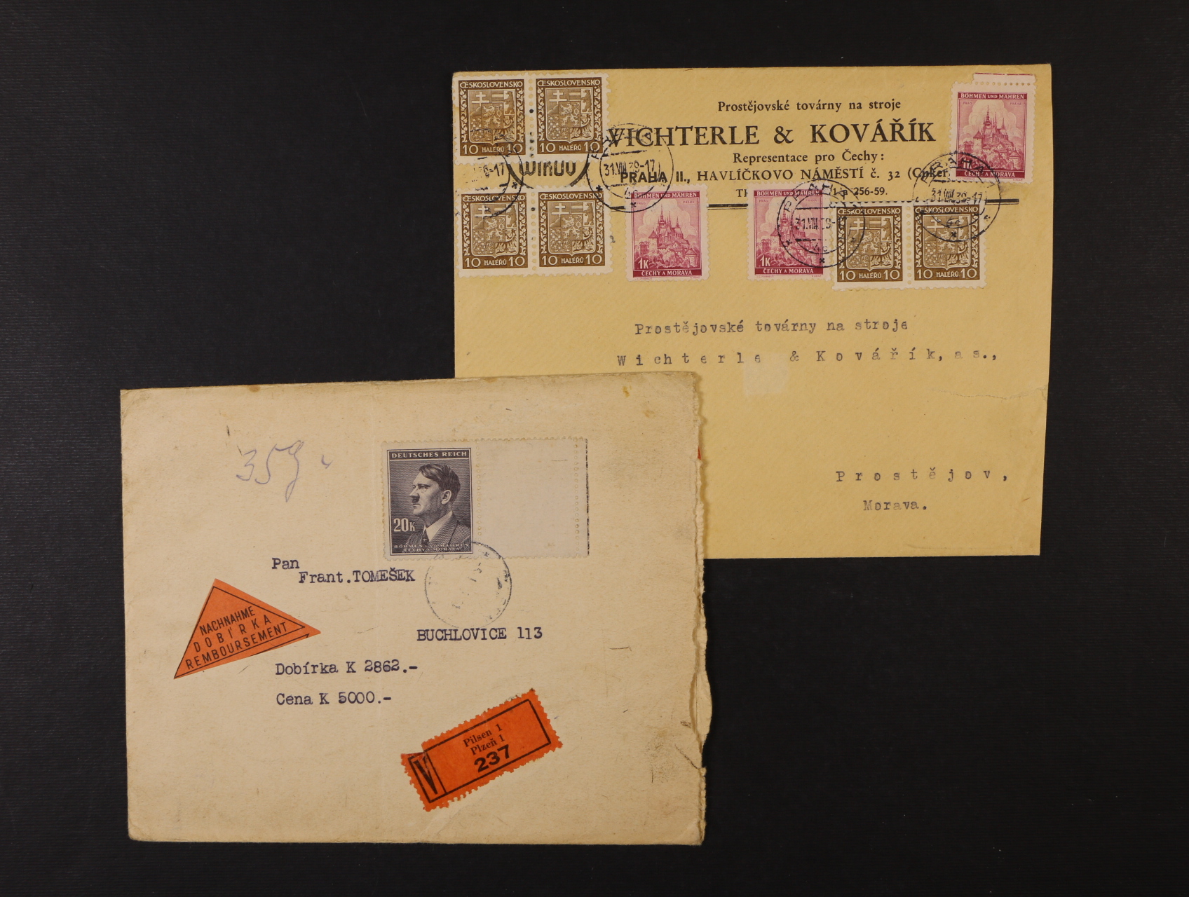 firemní R-dopis do Prostějova se smíš. frankaturou, pod. raz. PRAHA 1 31.8.39 a cenný dopis na 2862 K do Buchlovic, frank. zn. č. 97 s pravým kuponem, pod. raz. PLZEŃ 1