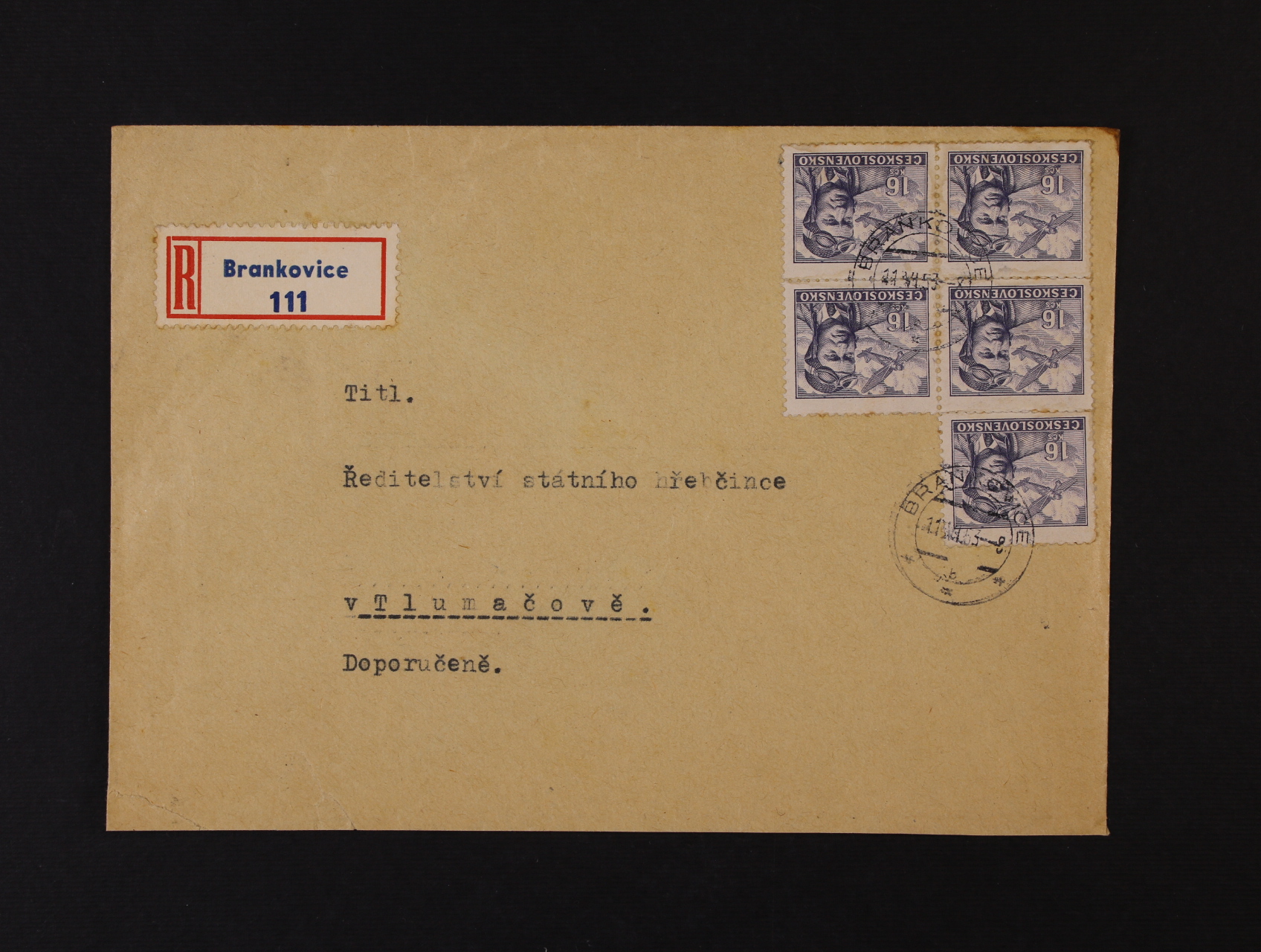 Měnová reforma - R-dopis do Tlumačova frank. zn. č. L 21 (5x), pod. raz. BRANKOVICE 11.6.53, zajímavé