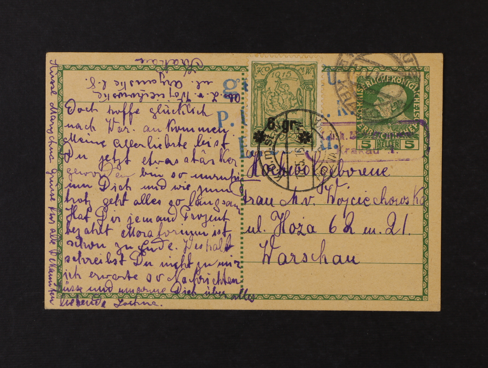 Městská pošta - rak. KL 5h F.J. 1908 do Varšavy s pod. raz. KRAKOW 13.5.16, dofrank. zn. Městské pošty Mi. č. 10 s DR POSZTA MIESKA K.O.M.St.W. 18.5.16