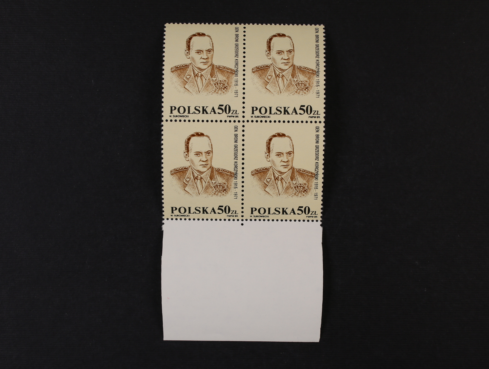 nevydaná zn. Mi. č. VI z r. 1989 s portrétem Gen. Korczyňski ve čtyřbloku se spodním okrajem, kat. cena cca 600 EUR