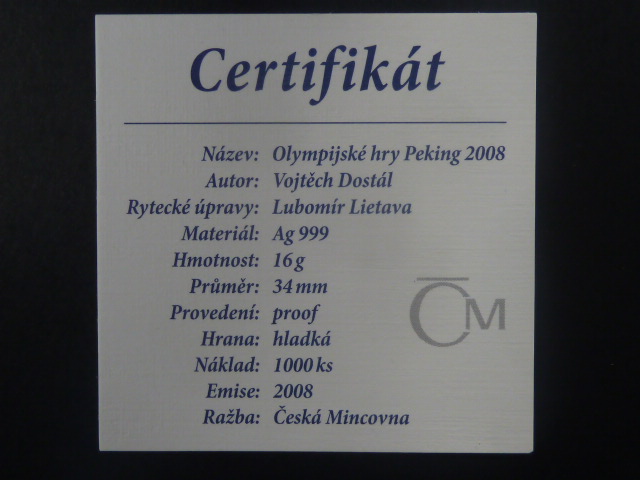 Olympijské hry Peking 2008, Ag 0,999, 16 g, náklad 1000 ks