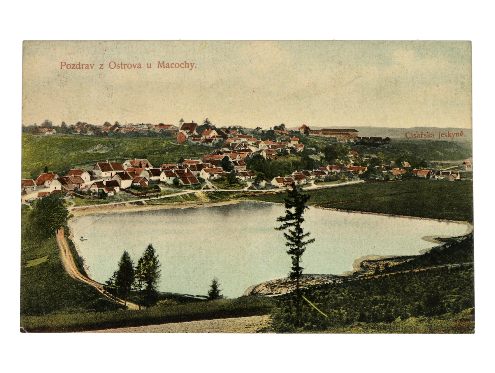 Ostrov u Macochy, okr. Blansko - bar. pohlednice, použitá 1908