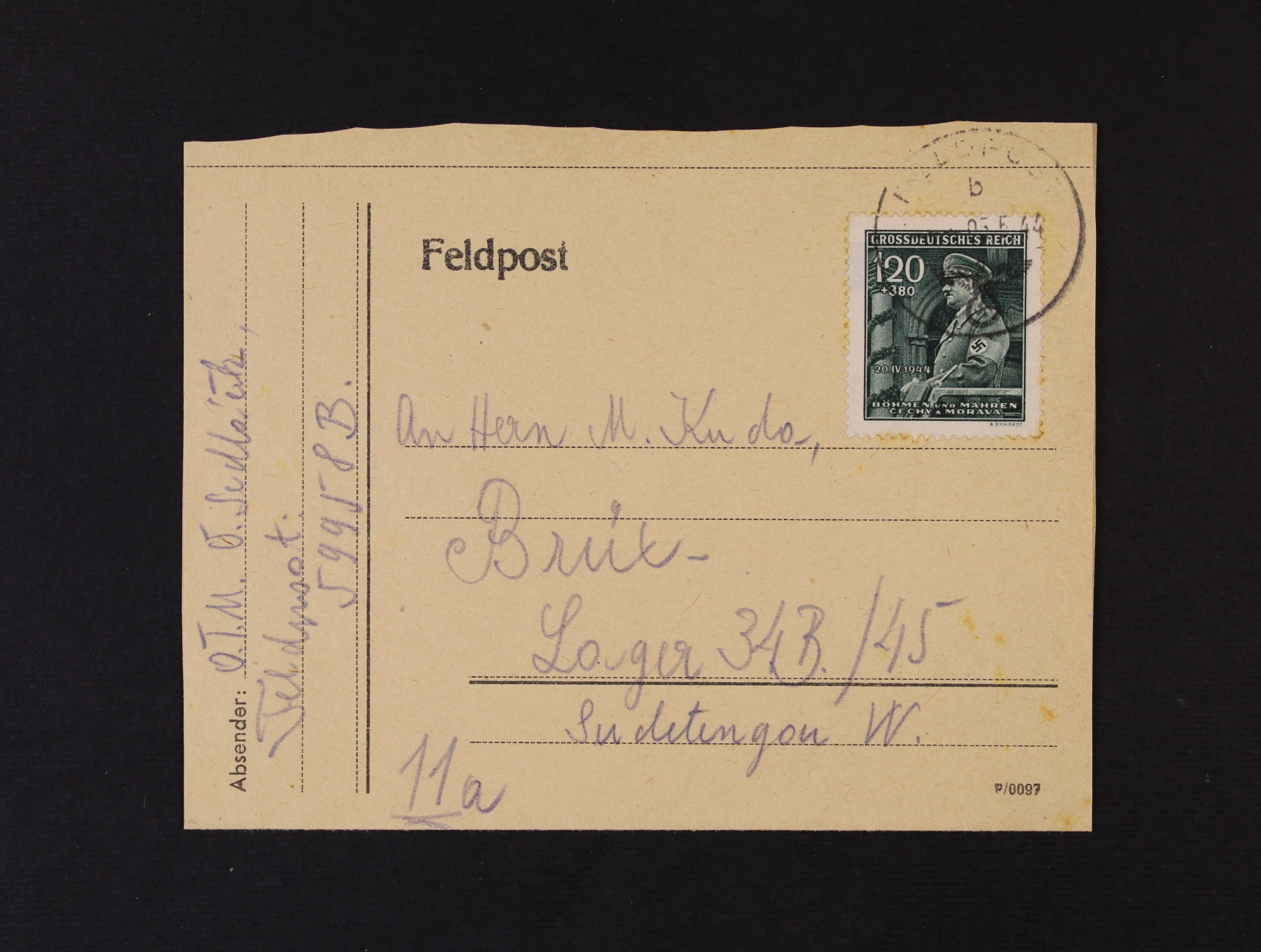 předtištěná zálepka PP od příslušníka O. T. M., frank. protektor. zn. a zaslaná do Lagru 34 B/45 Brüx, pod. raz. FELDPOST 5.5.44, zajímavé