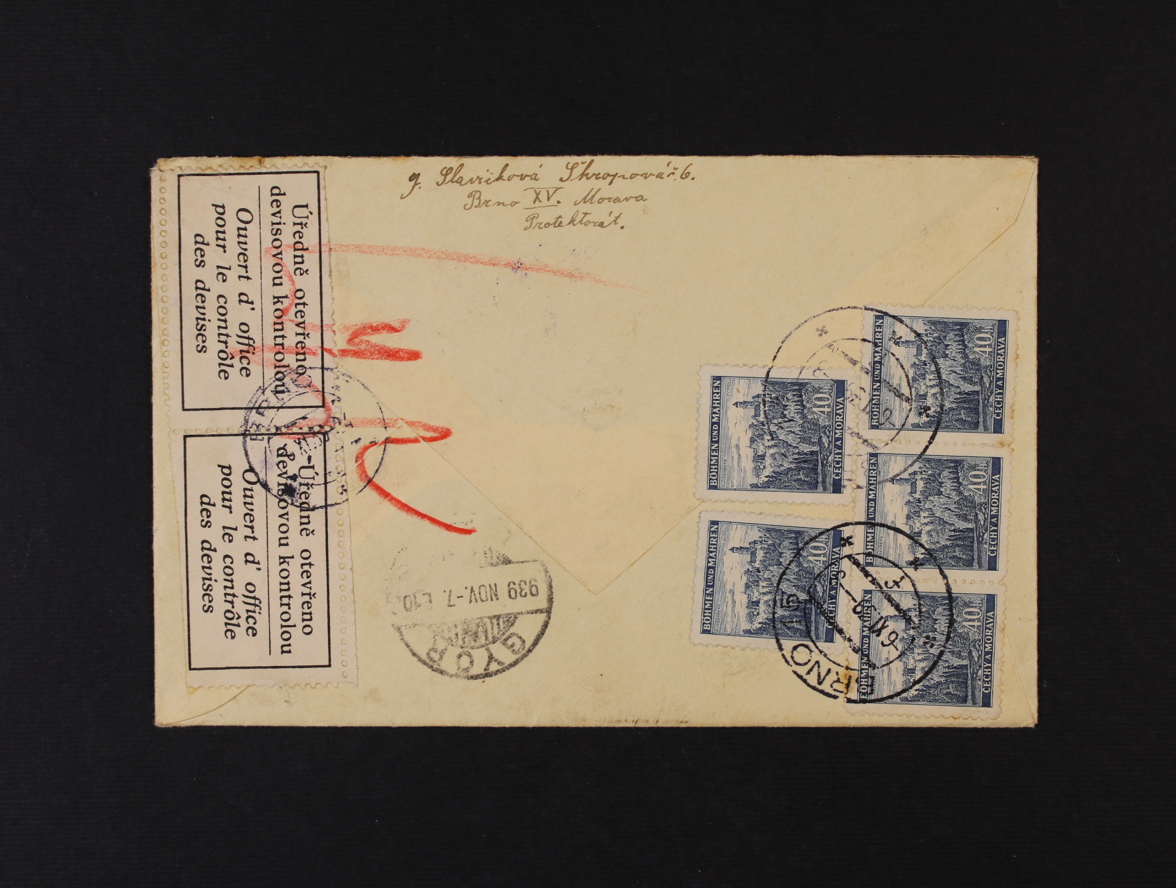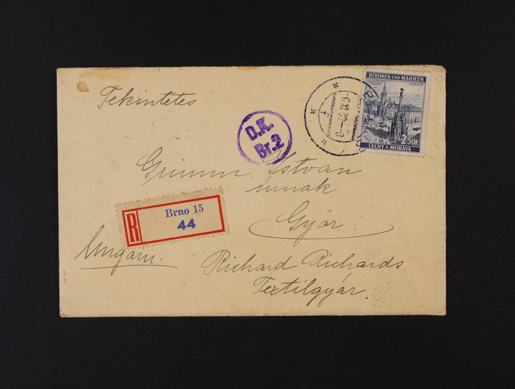 R-dopis do Maďarska frank. zn. č. 35 na přední str. a zn. č. 28 (5x) na zadní str., pod. raz. BRNO 15 6.11.39 + přídavné kulaté fialové raz. D.K. Br. 2, na zadní str. přilepená nálepka Úředně otevřeno