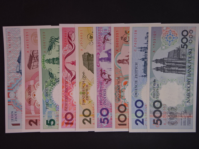 sada nominálů 1–500 Zlotych 1990, nevydané, BNB. BNP810.001a - 810.500a, 9 kusů, originální obal