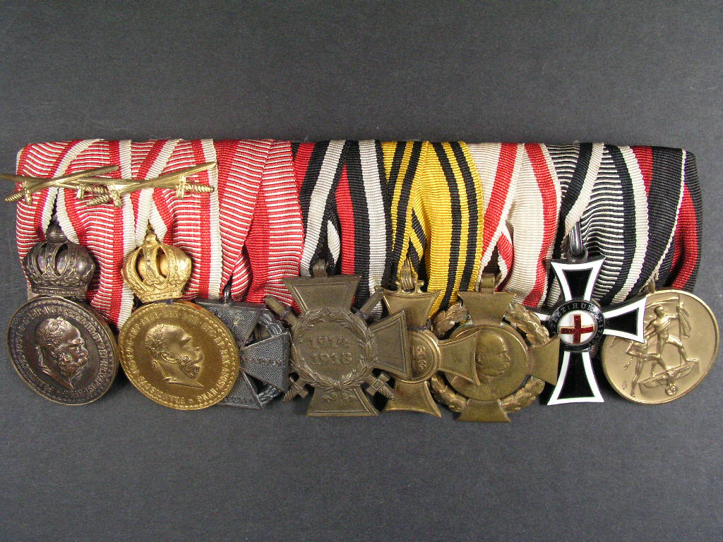 Stříbrná vojenská záslužná medaile Signum Laudis F.J.I., postříbřený bronz, Vojenská záslužná medaile Signum Laudis F.J.I., zlacený bronz, Pam. kříž na I. sv. válku německo, Karlův vojenský kříž, pozdější ražba, 1. republika, 3. říše, Mobilisační kříž 1912-13, Jubilejní kříž 1908 na vojenské stuze, Kříž Mariánů, medaile za obsazení sudet Německo