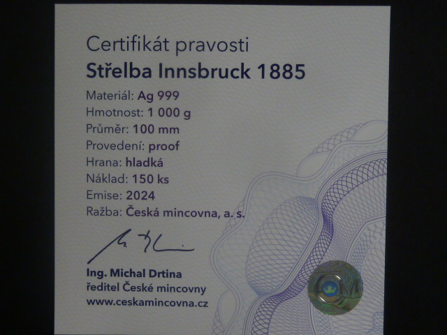 Střelba Innsbruck 1885, novoražba ČM 2024, Ag 1000 g, náklad 150 ks, etue, certifikát