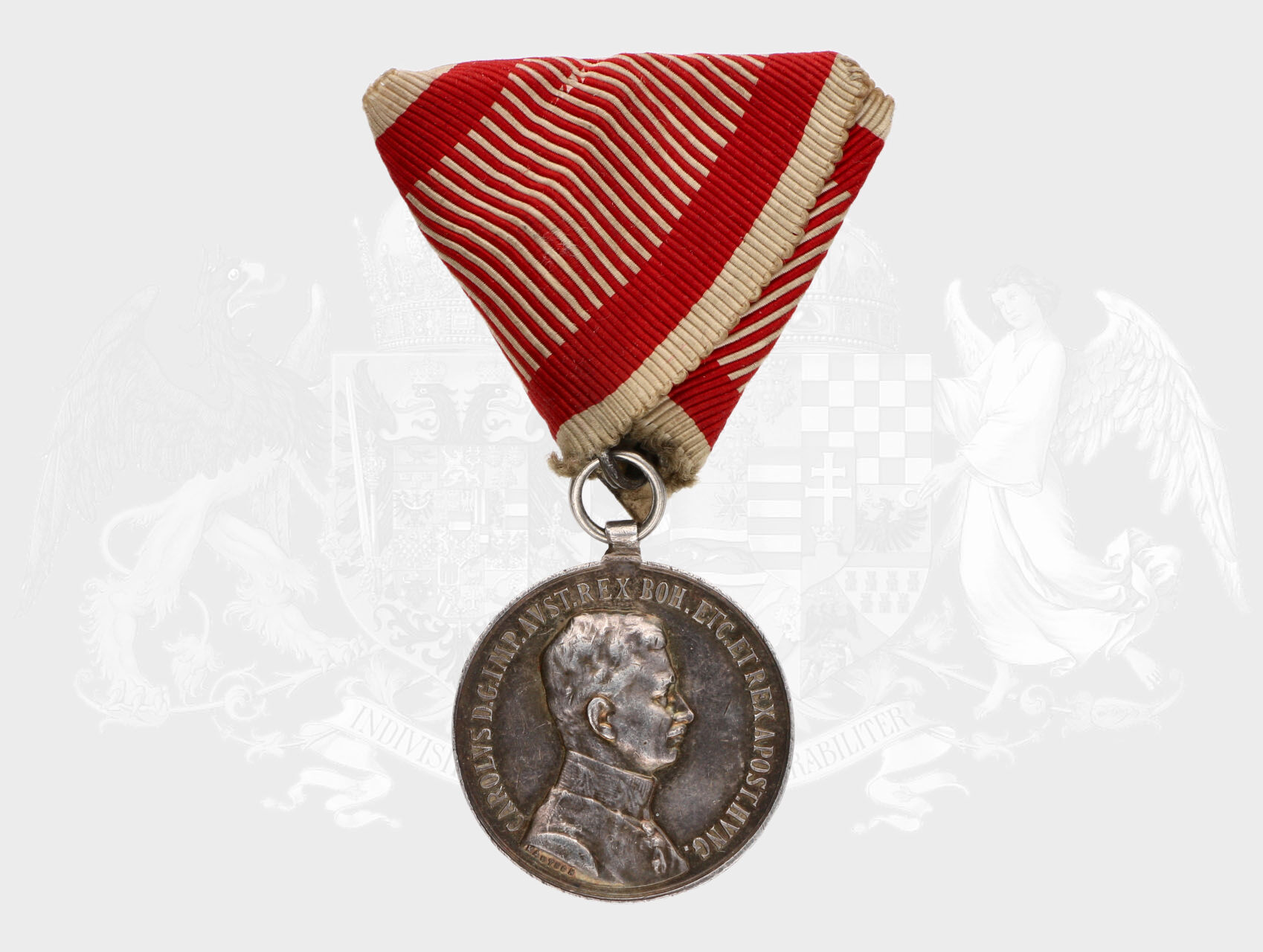 Stříbrná medaile za statečnost 2. třídy, 9. vydání 1917-1918 Karel, na hr. punc hl. punc. úřadu Vídeň, A v kroužku, původní vojenská stuha