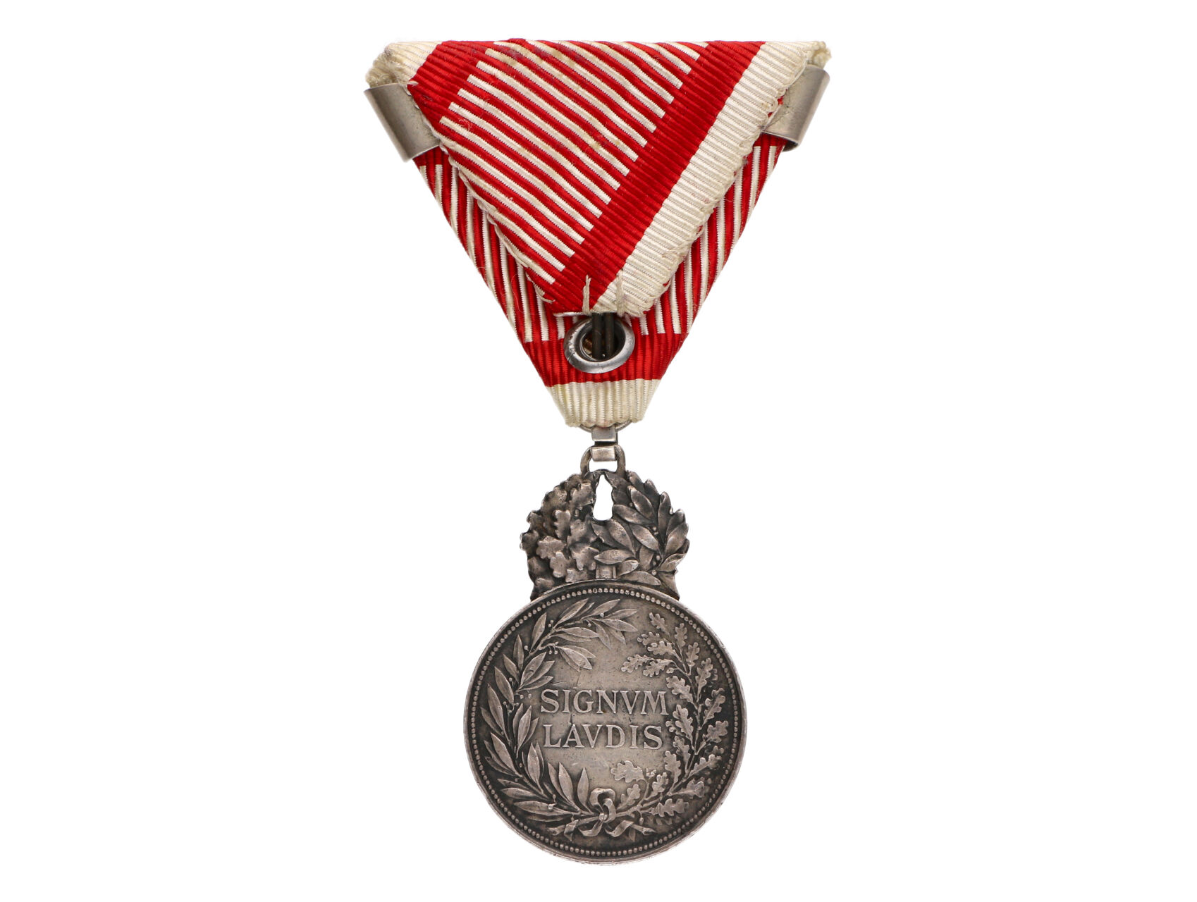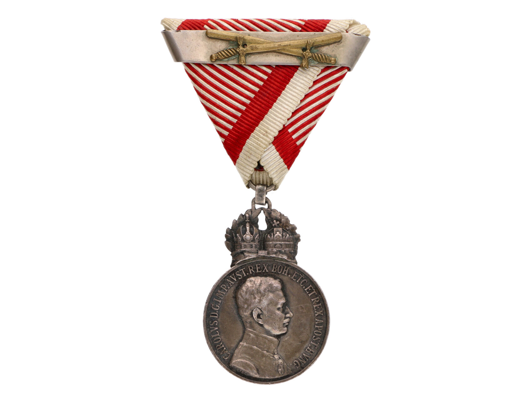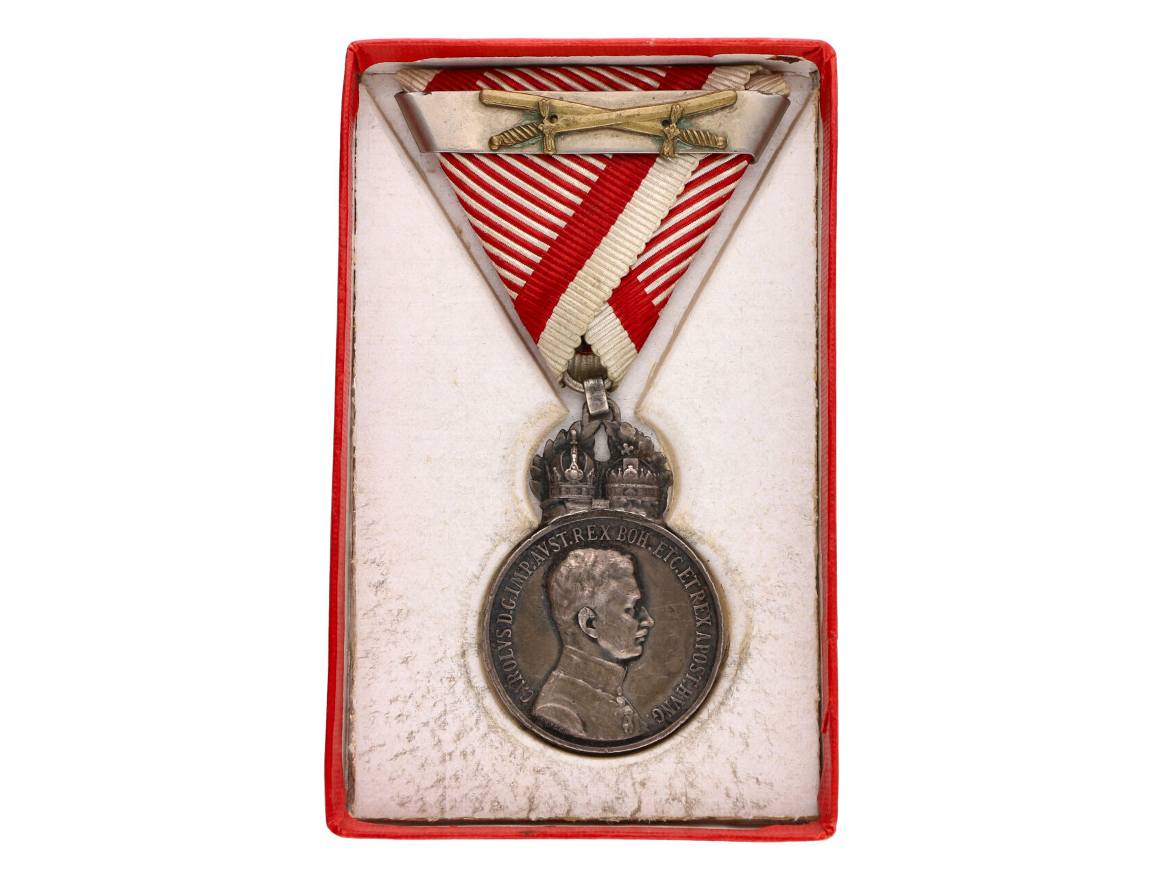 Stříbrná vojenská záslužná medaile Signum Laudis, Karel, Ag, na hraně značka hl. punc. úřadu ve Vídni, A v kroužku, původní voj. stuha s páskem za druhé udělení, značená ZIMBLER WIEN a meči, pův. etue