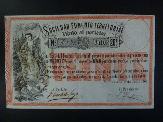 URUGUAY, 20 Pesos Montevideo 1. 6. 1868, Pi. S. 482