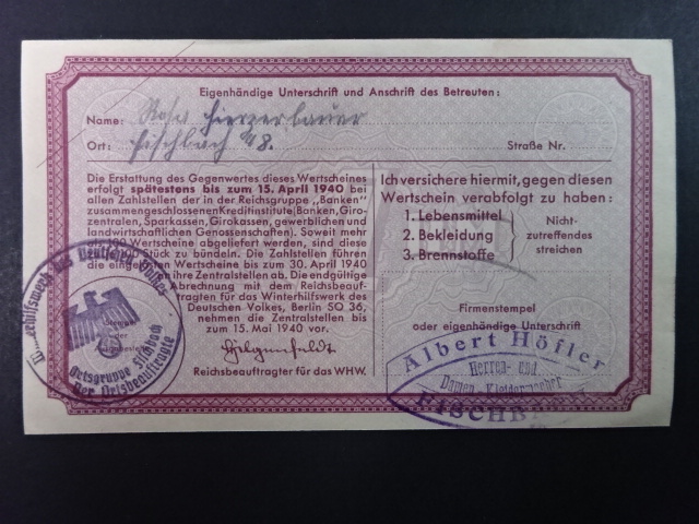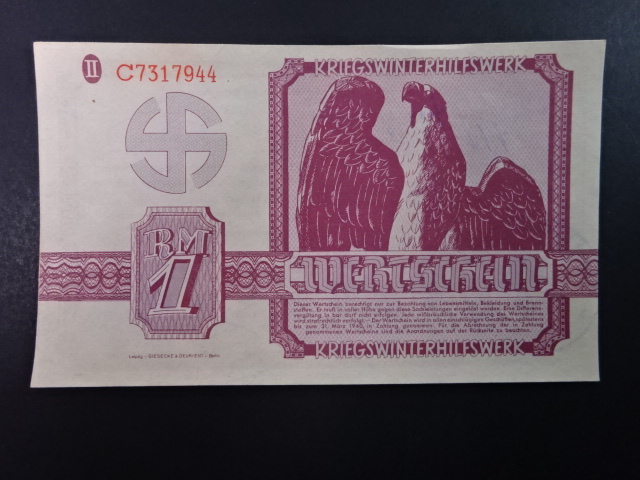 Winterhilfswerk 1934-1944 (Zimní pomoc), 1 RM 1939/1940 série C Reihe II, Ro. 712, Grab. WHW-13