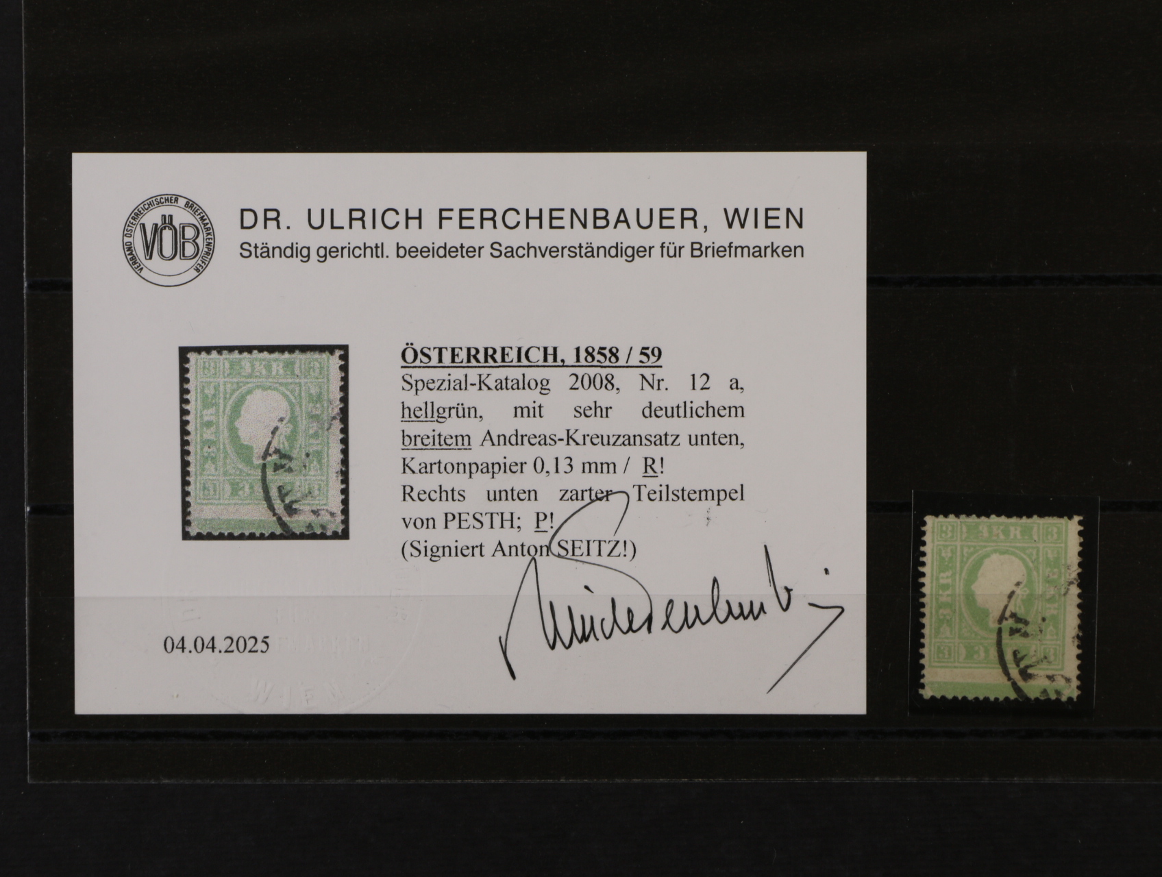 zn. Fe. č. 12a 3kr světlezelená s částí Ondřej. kříže na spodním okraji, karton. papír 0,13 mm, zk. Anton Seitz, atest Ferchenbauer (raritní kus)