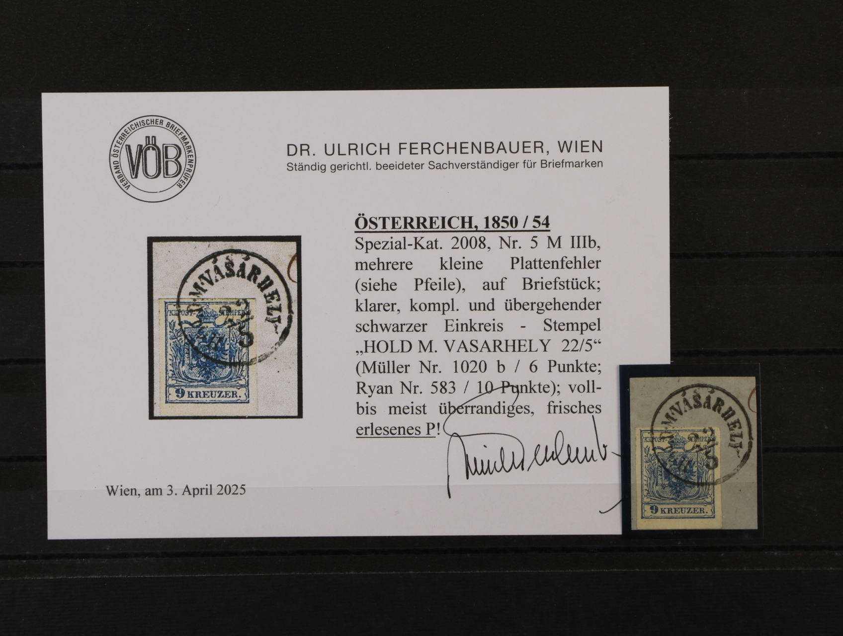 zn. Fe. č. 5 M, typ IIIb s DV několik bílých skvrn v obrazu zn. na výstřižku s kompl. jednokruh. raz. HOLD EM. VASARHELY 22.5., zk. a atst Ferchenbauer