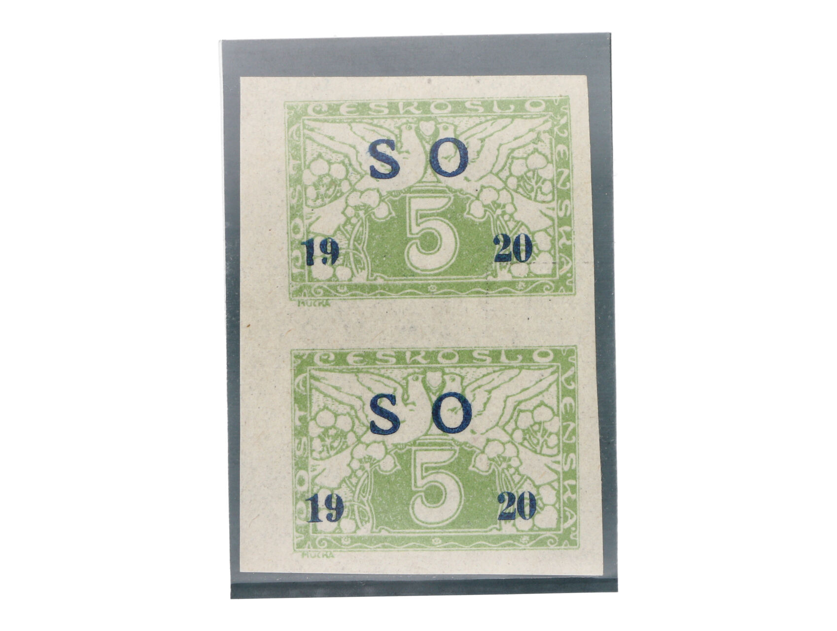 zn. SO č. 27 N bílý papír, modrý přetisk ve svislé dvoupásce, nepatrná stopa po nál. na horní zn., lux. střih, zk. Gilbert, Vrba, kat. cena cca 1900 Kč