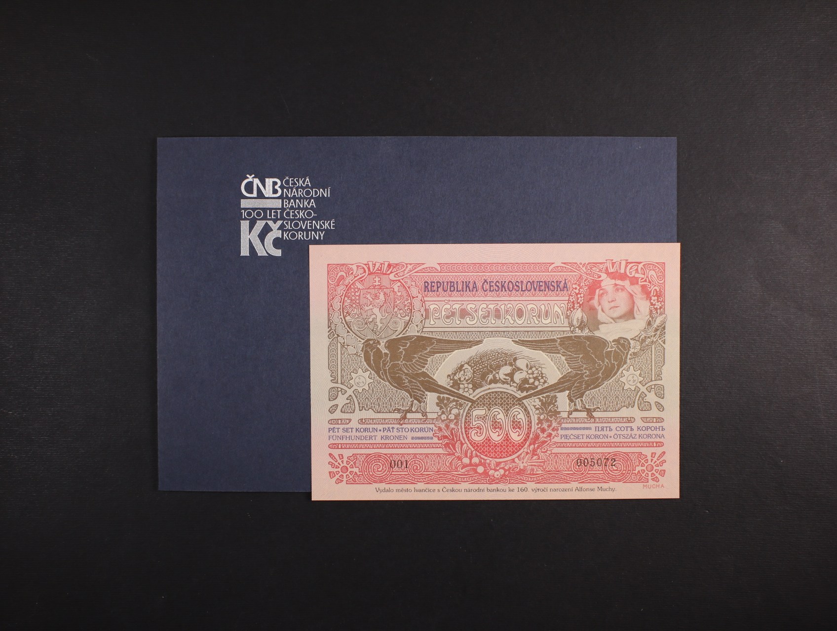 500 Kč 1919 novotisk série 001 005072, vydání pro ČNB se sérií nad 5000 na papíře s vodoznakem a bez UV tisku - vydání ČNB 2020, dárkový obal