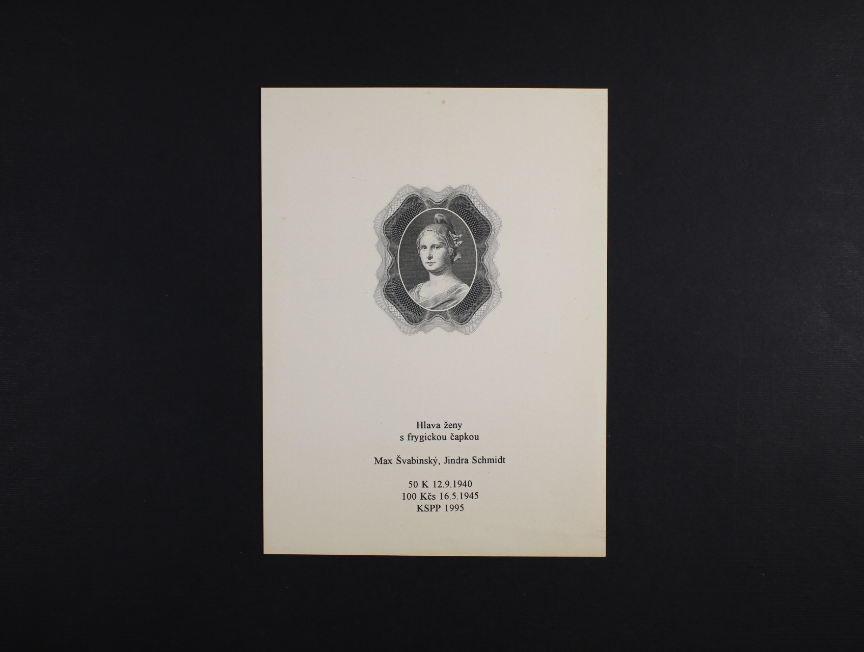 pamětní tisk ČNS PPP, hlubotiskový nátisk portrétu Mladé republiky z líce 100 Kčs 1945 na kartonovém papíře s přítiskem KSPP 1995