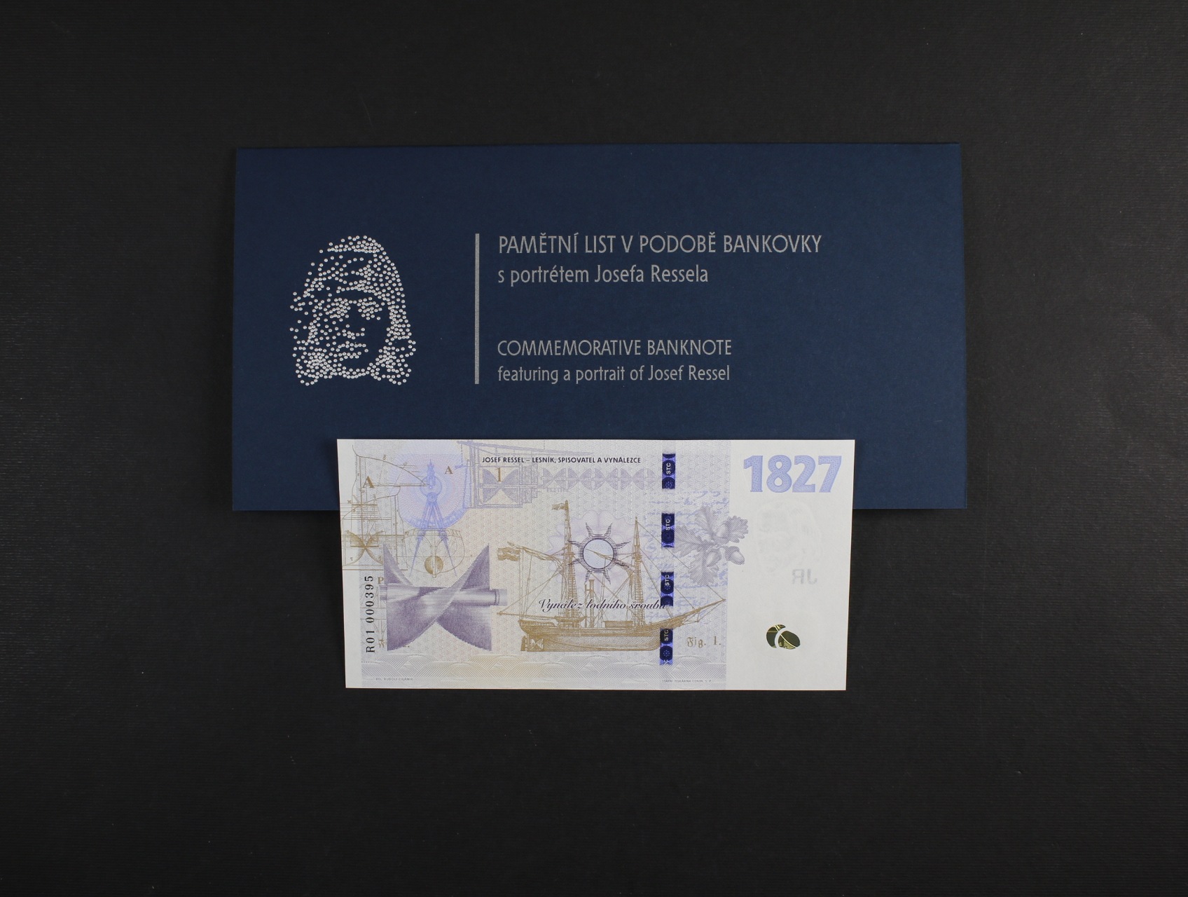 pamětní tisk STC v podobě bankovky "1827" série R01 000395 Státní tiskárny cenin k výročí Josefa Ressela, nové technologie tisku, mikroperforace, nový papír a ochranné prvky, série R01 k propagačním účelům, odlišný dárkový obal