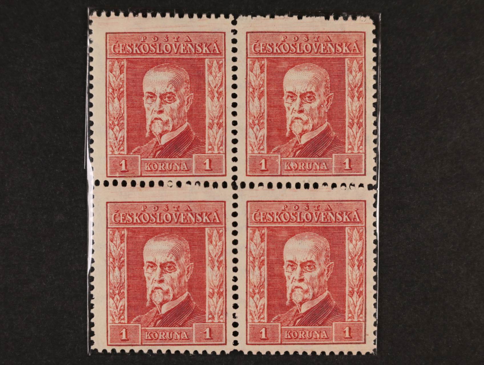 zn. č. 185 ve čtyřbloku s velkým posunem přetisku až do další zn., zk. Mrňák