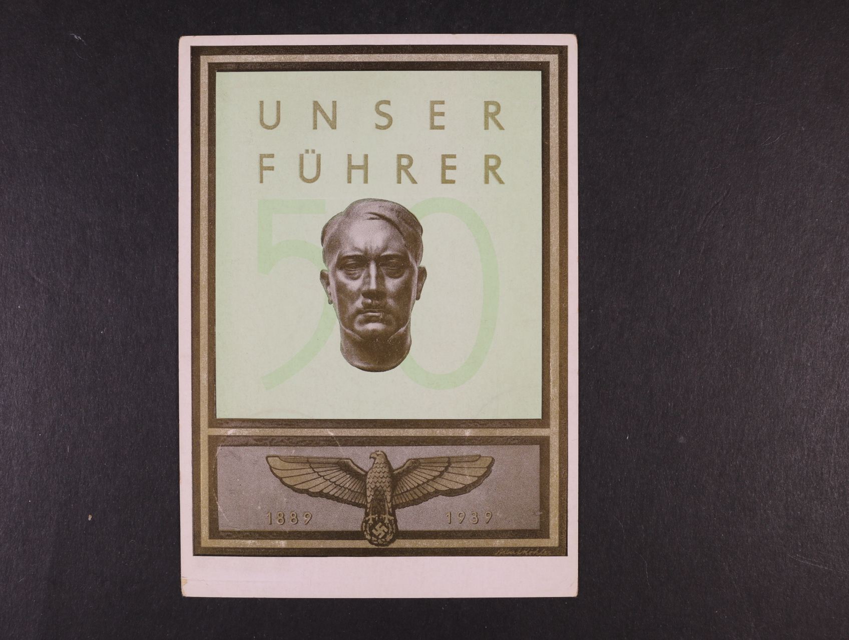 843 fotopohlednice s portrétem A. H., nepoužitá, na zadní str. pam. raz. PRAHA 1 20.4.39 50. VÝROČÍ NAROZENIN VŮDCE 200