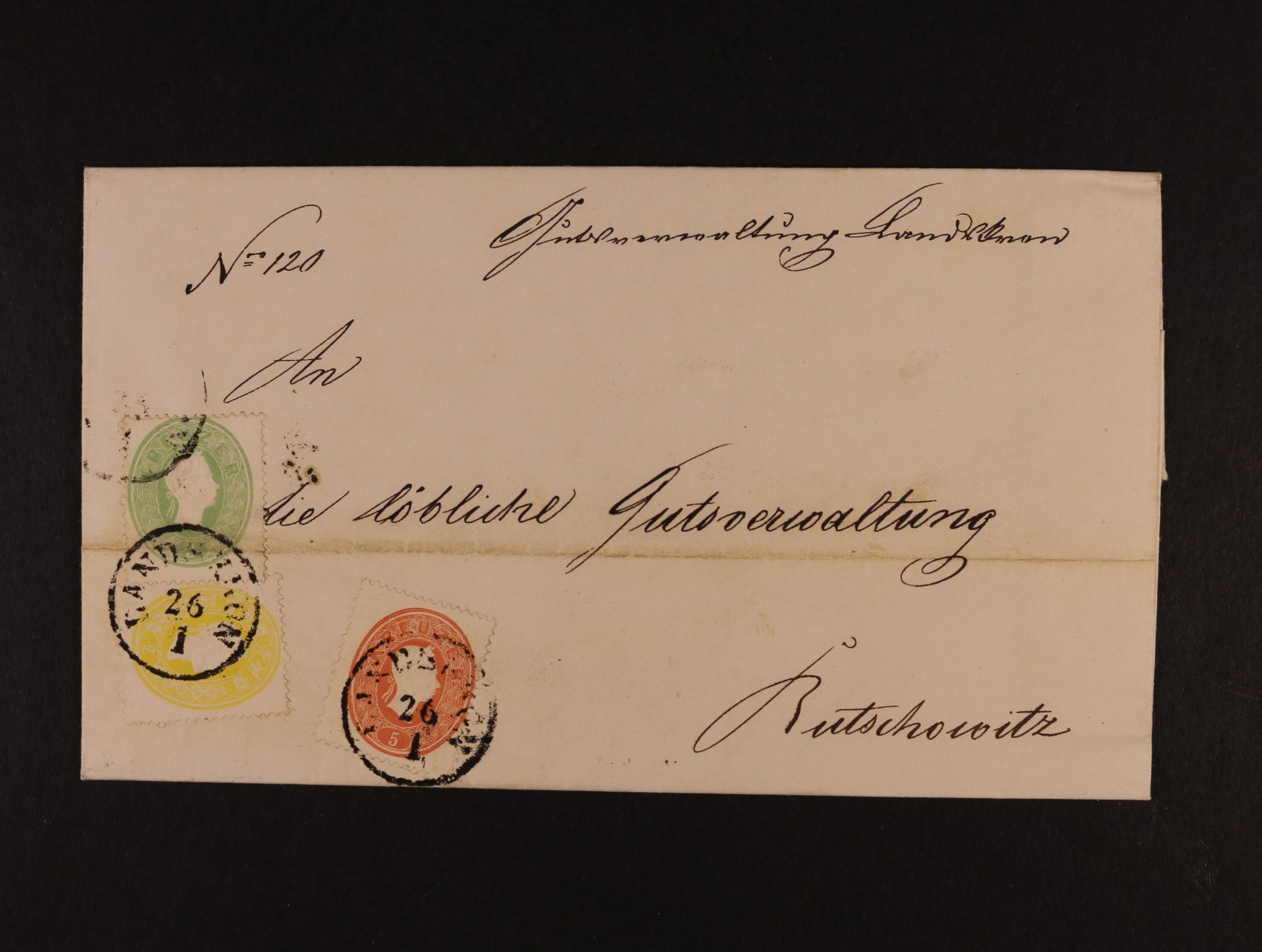 skl. dopis z r. 1863 do Bučovic frank. zn. Fe. č. 18 + 19 + 20 - tříbar. frankatura, pod. raz. LANDSKRON 26.1., přích. raz. BRÜNN 26.1., ve spodní části vodorovný registr. lom