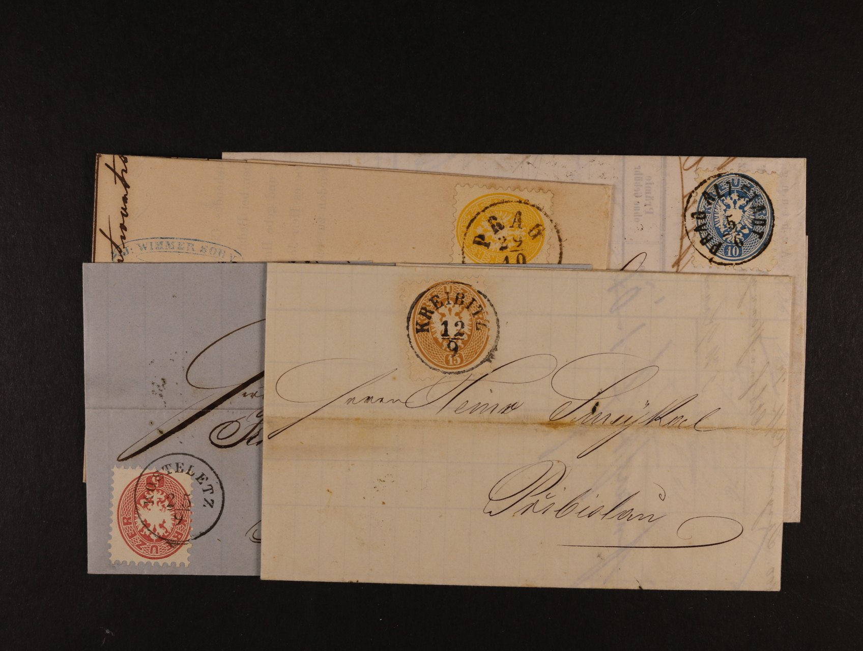 sestava 4 ks skl. dopisů frank. zn. Fe. č. 18 - 22 s raz. PRAG, BLATNÁ, PRAG, KREIBITZ, lux. kvalita