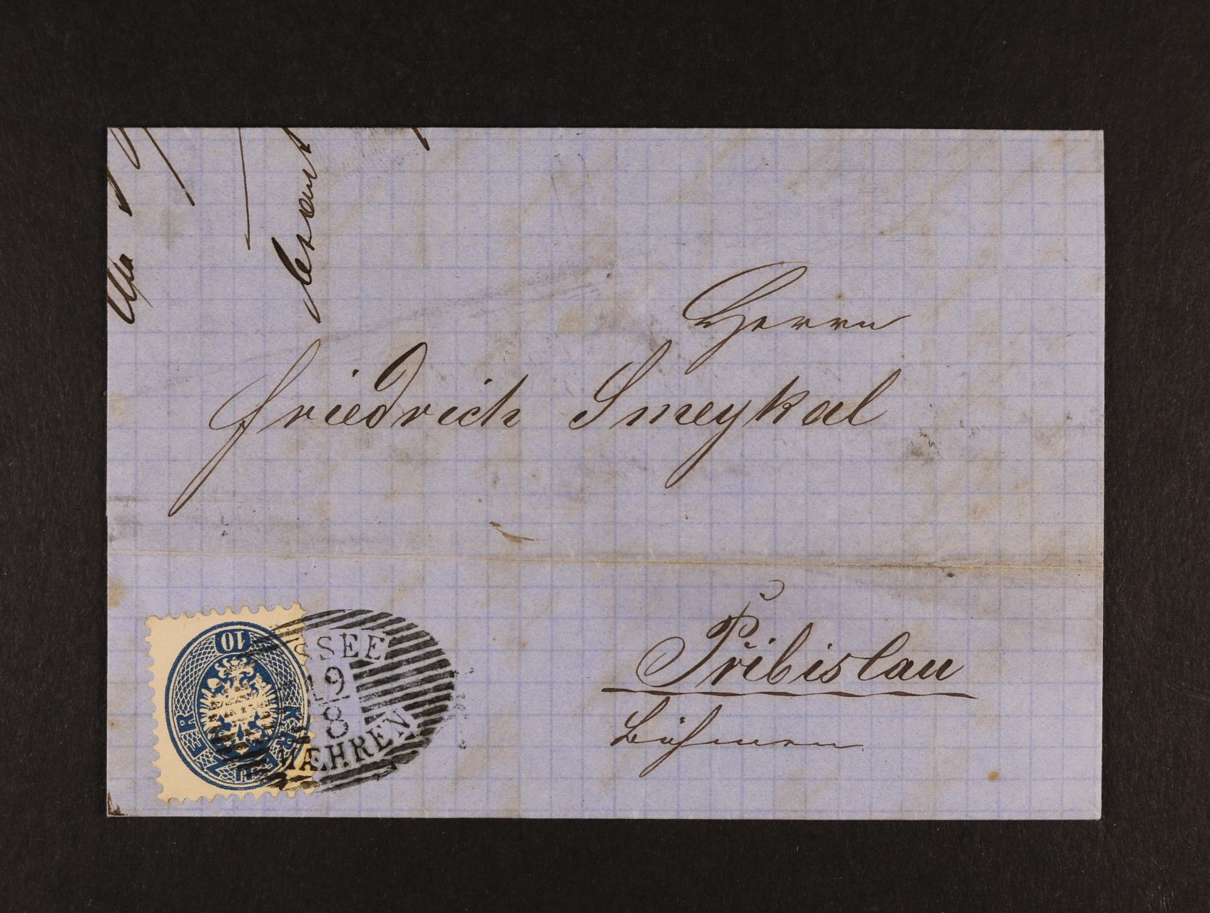 skl. dopis z r. 1865 frank. zn. Fe. č. 33 s oválným linkovým raz. AUSSEE 19.8. MAHREN, průch. a přích. raz., zajímavé