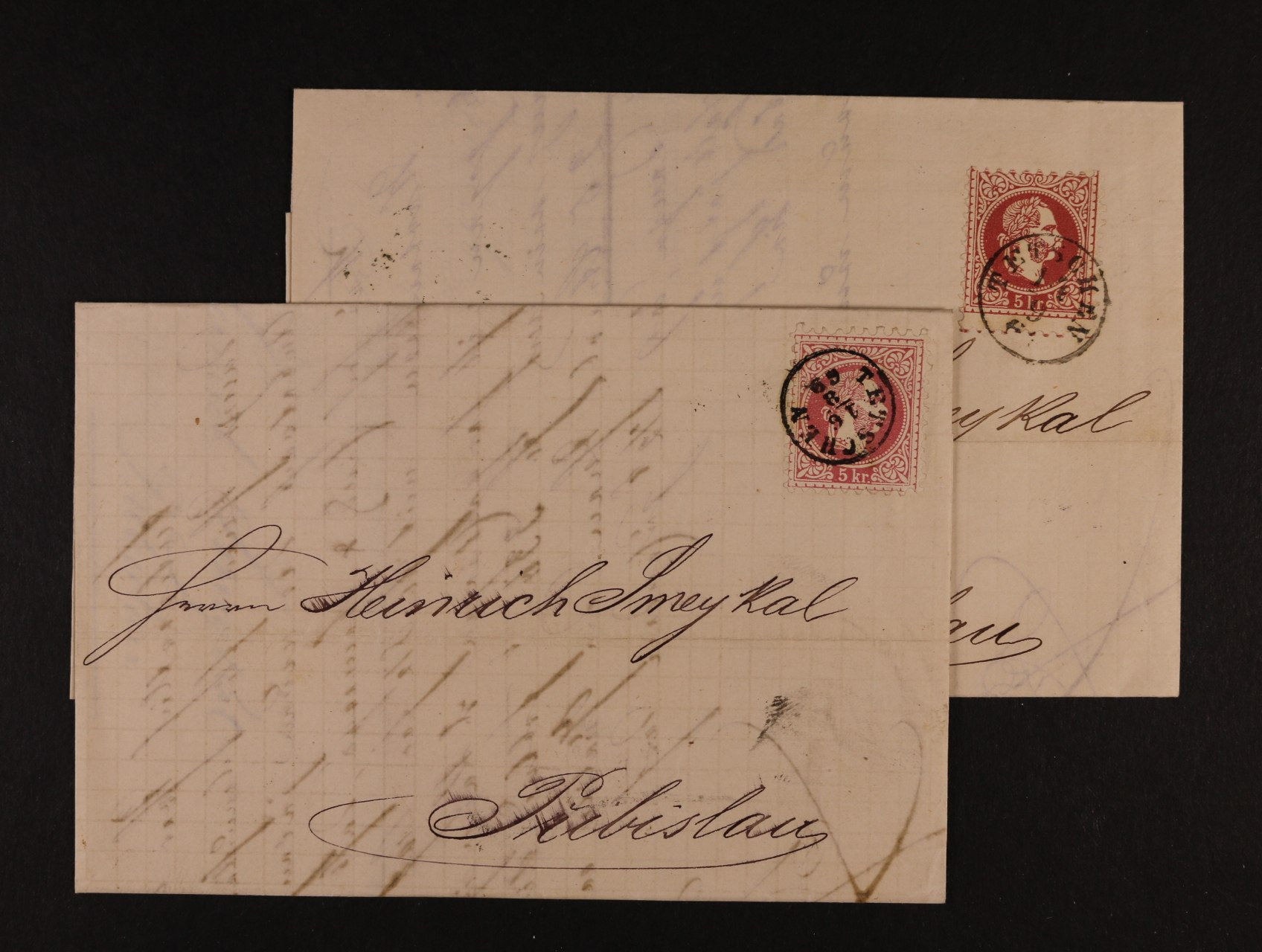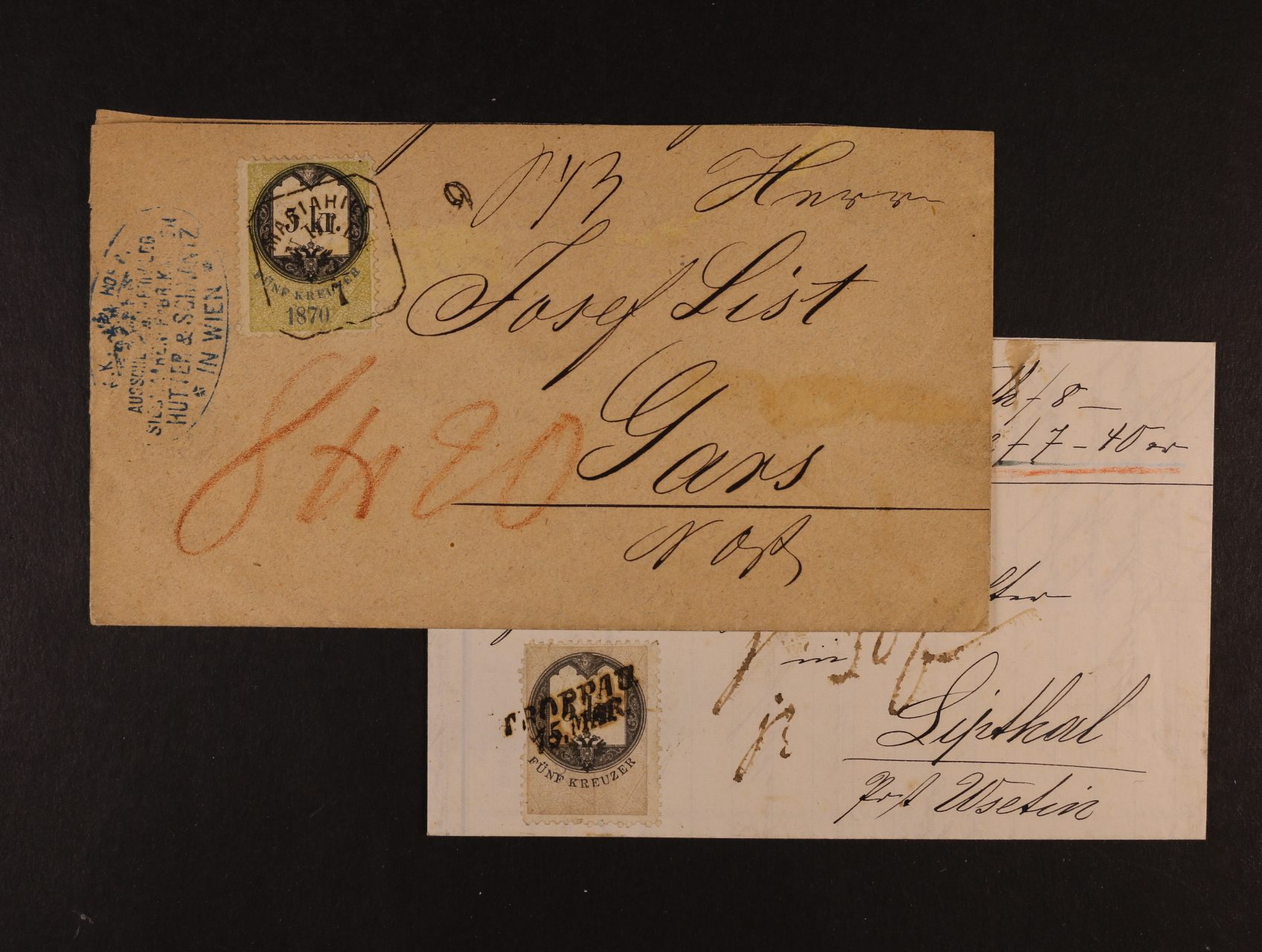 skl. balíkový průvodní dopis frank. kolkovou zn. 1kr s pod. raz. TROPPAU 15.MAR., menší část spodní strany odtržena + dtto obálka frank. kolkovou zn. 5kr s rámeč. raz. MARIAHILF
