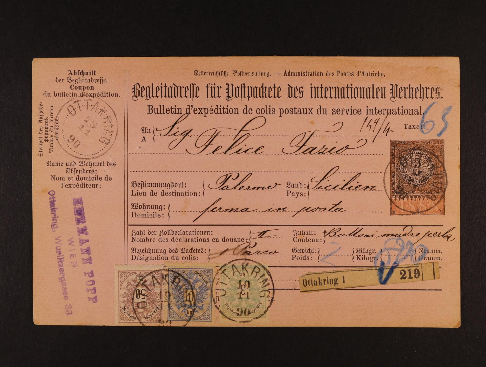kompl. 3-dílná průvodka do Palerma, FERMA IN POSTA (tj. Poste Restante !), se známkami 3+10+50kr "Doppeladler", raz. Ottakring, bezvadná kvalita, velmi vzácná frankatura!