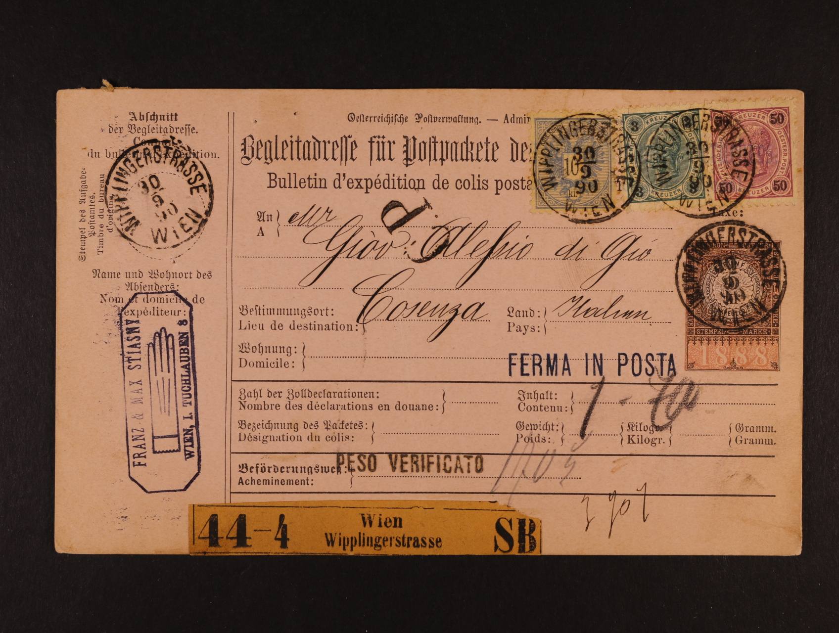 celá poštovní průvodka z Vídně do Itálie, smíšená frankatura 10Kr 1883 + 3Kr + 50Kr 1890....vzácná frankatura, navíc POSTE RESTANTE (FERMA IN POSTA), kat. Ferch. min. 800 EUR