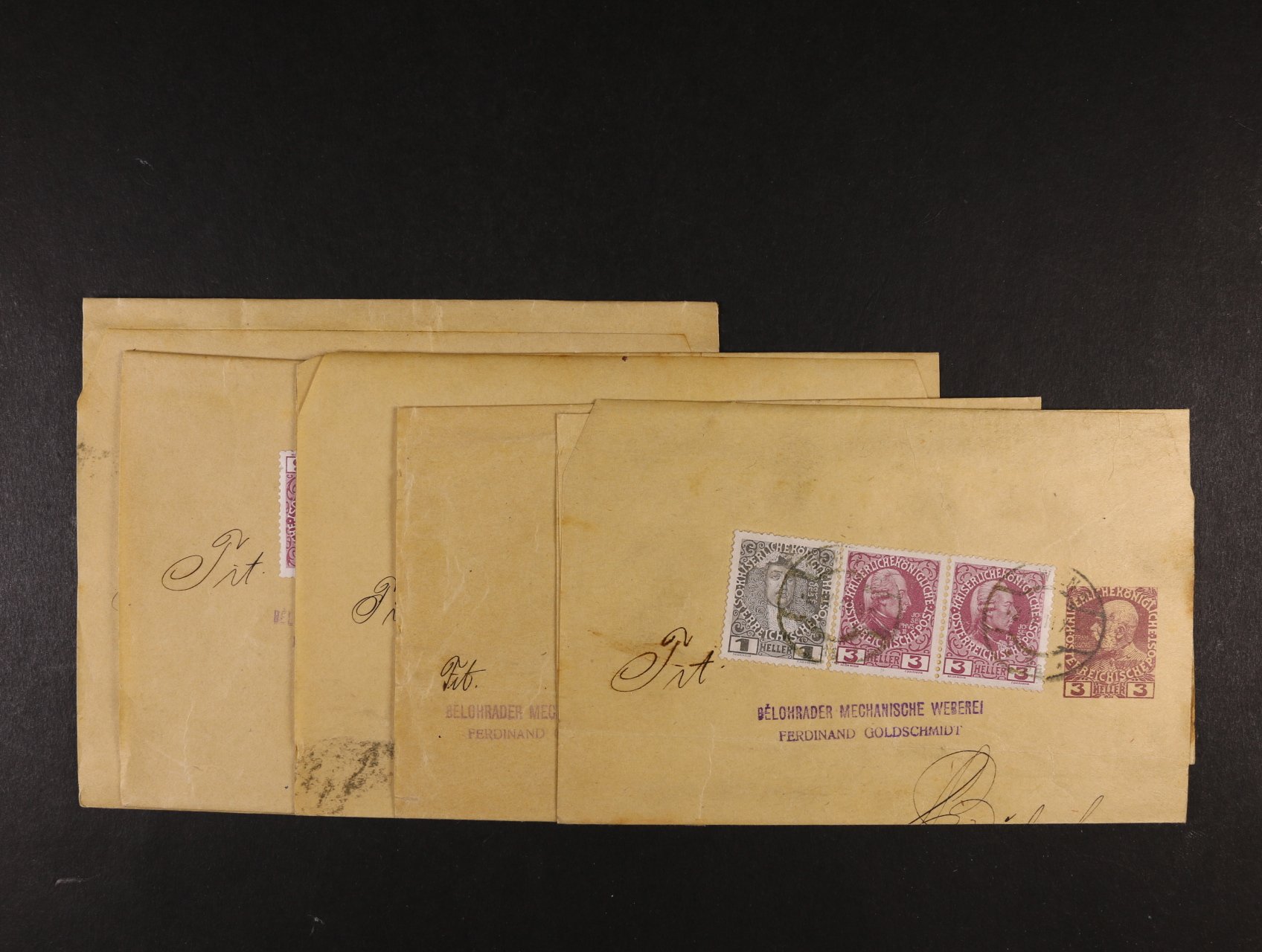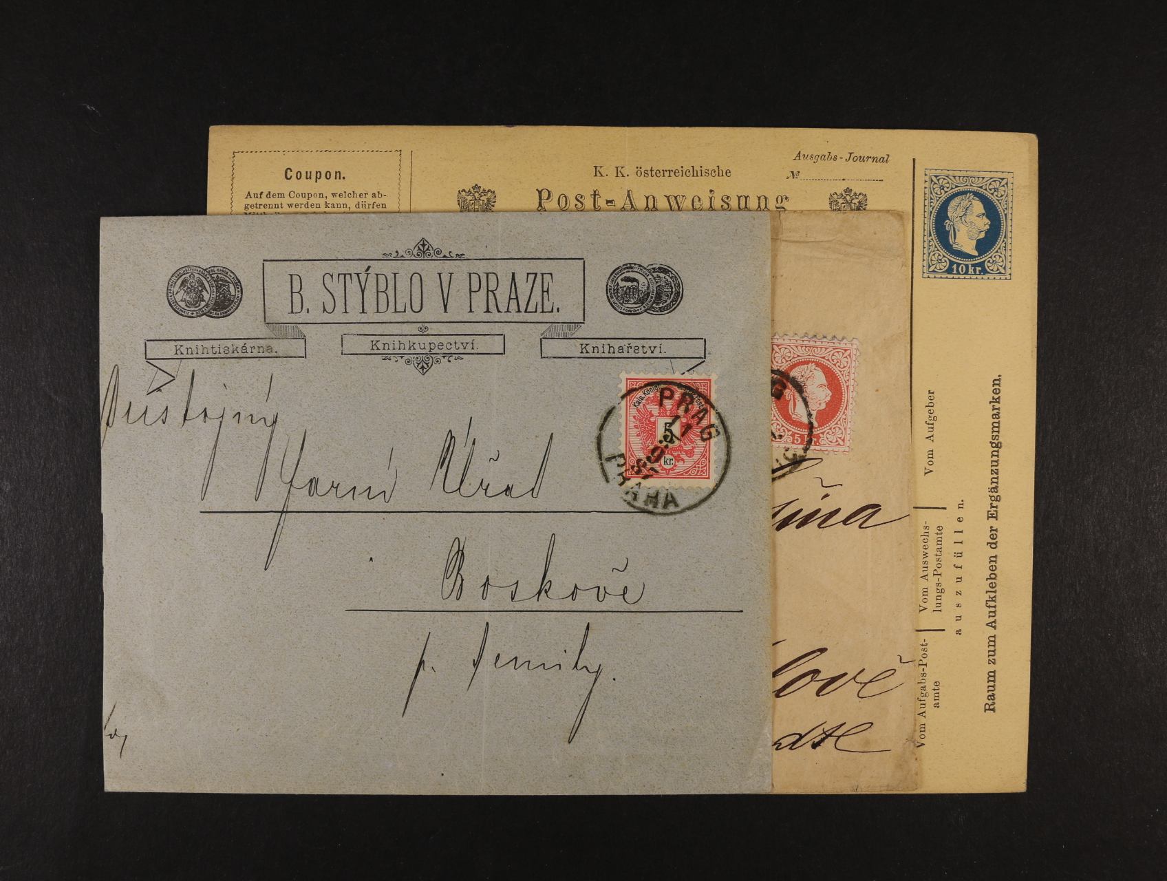 kompl. vyplněná poštovní průvodka s natištěnou zn. 10kr F.J.z 6. emise + dvě obálky s firemními přítisky frank. zn. 6. a 7. emise