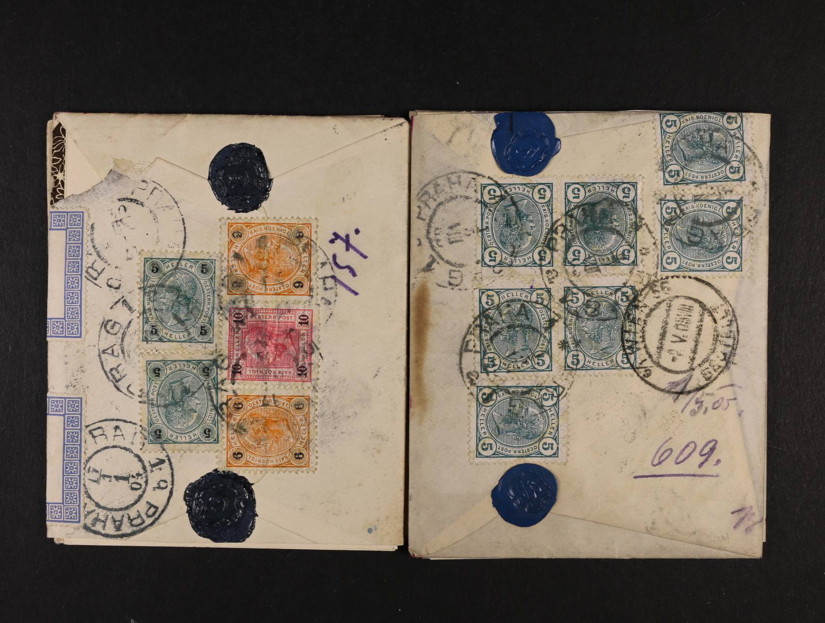 sestava 5 ks R-dopisů z Prahy v místě a do Vídně (2), pěkné násobné (mj. 7x5h) a 3-barevné (mj. 6+6+10+5+5h) frankatury, malé formáty, včetně obsahů, "jeden příběh"