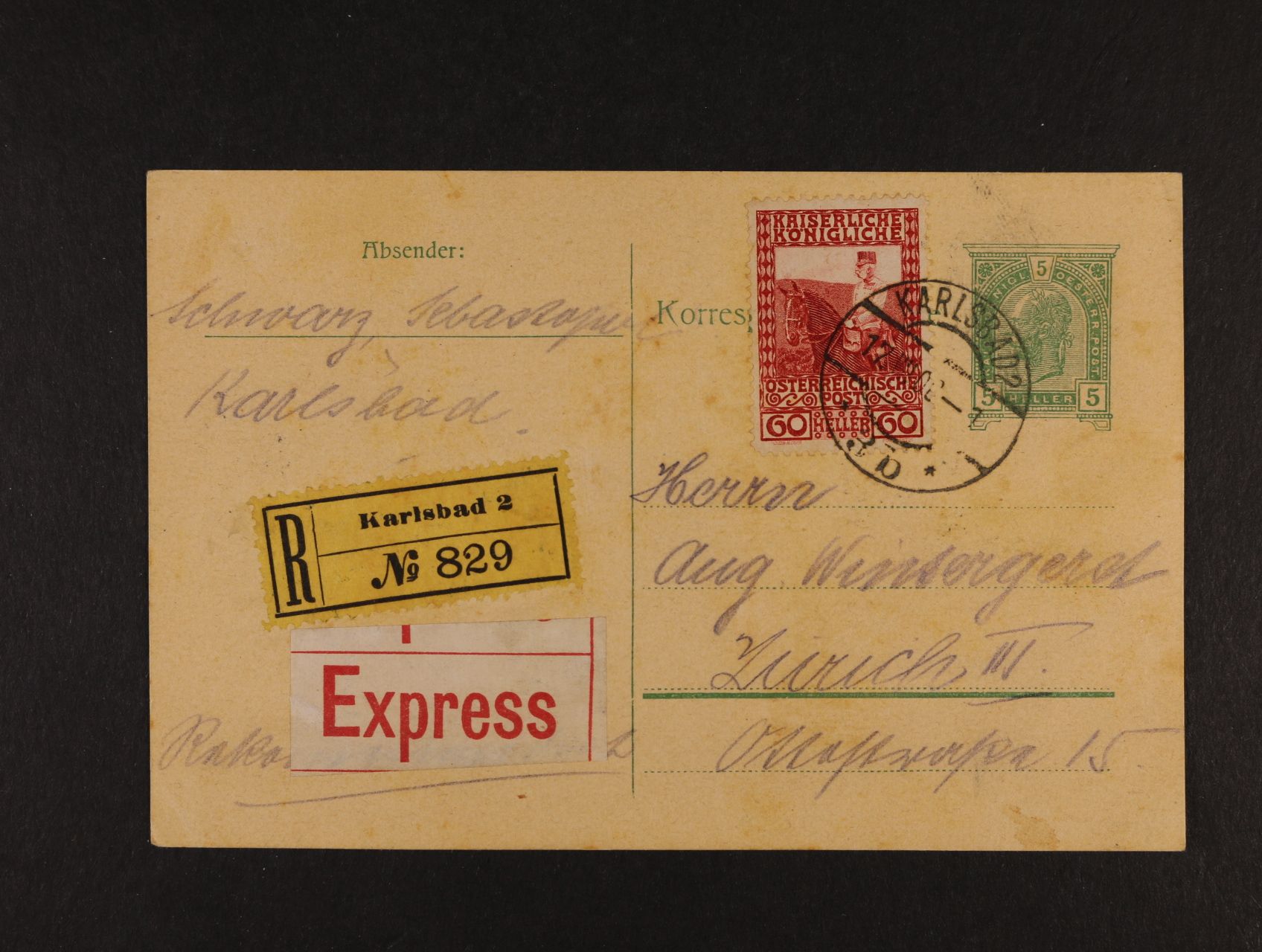KL Fe. č.175, 5h zelená vydání 1907 + 60h vydání 1908, vzácná smíšená frankatura Reko-Express , přesná frankatura 65h (10+25+30), z K. Varů do Zurichu, kat. min. 450 EUR, tranzit raz. Nurnberg, příchozí Zurich