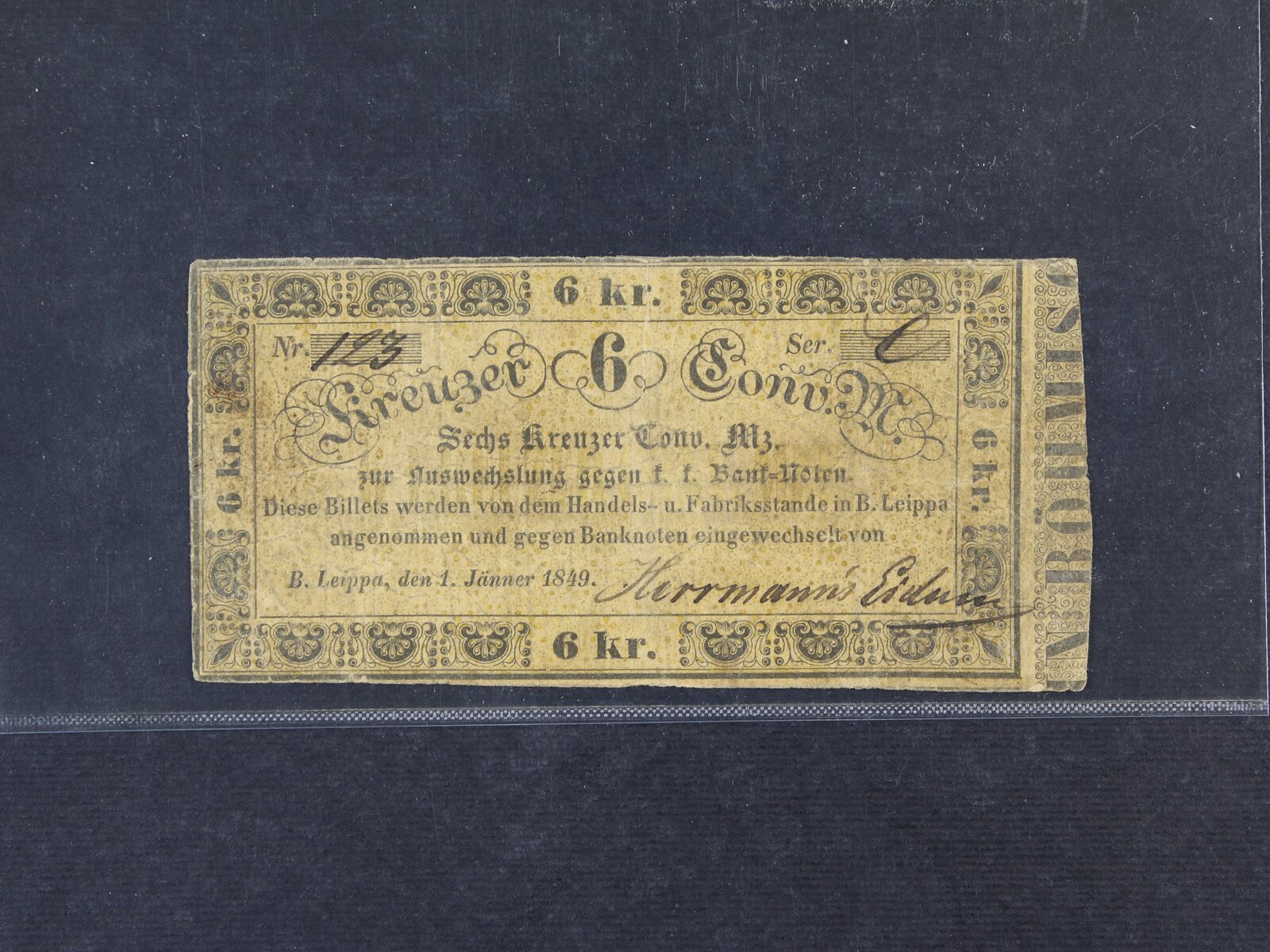 Böh. Leippa (Česká Lípa), 6 kr. C.M. 1.1.1849 Herrmanns Eidam, V.R. 115.30.02.a.I.O, kupón v pravo, podlepená
