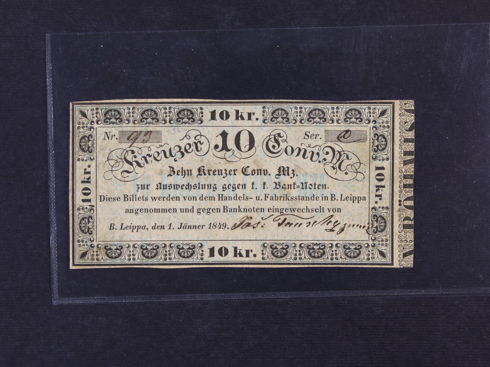 Böh. Leippa (Česká Lípa), 10 kr. C.M. 1.1.1849 Jos. Tausch junior, V.R. 115.36.03.a.I.O, kupón vpravo