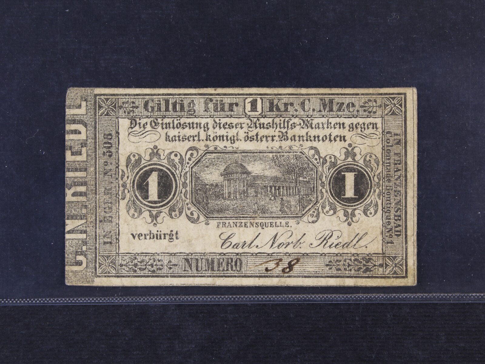 Eger & Franzensbad (Cheb a Františkovy Lázně), 1 kr. C.M. b.d. Carl Norbert Riedl, formulář, V.R. 270.02.01.a.I.O