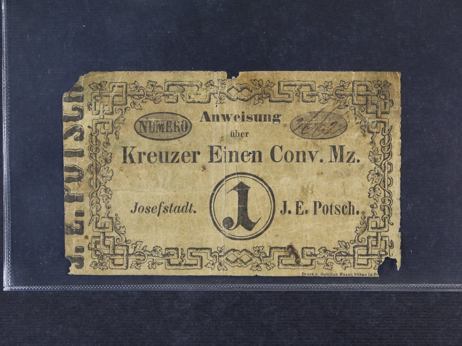 Josephstadt (Josefov), 1 kr. C.M. 20.4.1849 J.E.Potsch, V.R. 575.04.07.O