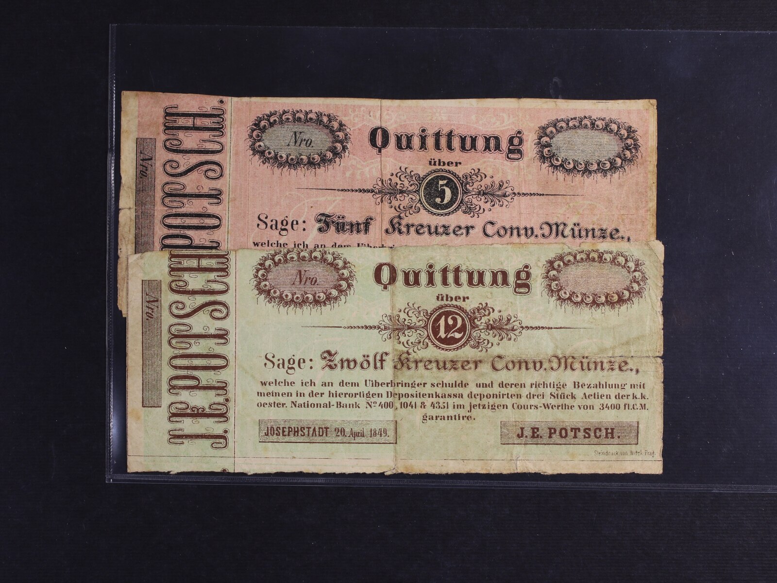 Josephstadt (Josefov), 6 kr. a 12 kr. C.M. 20.4.1849 J.E.Potsch, V.R. 575.04.04.O, 05.O, 2 kusy