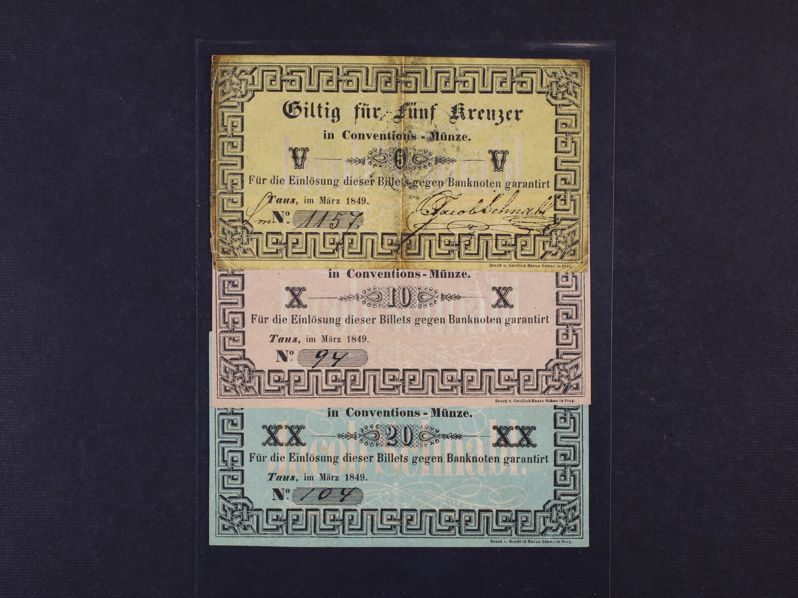 Taus (Domažlice), 5 kr., 10 kr. a 20 Kr. C.M. III.1849 Jacob Schnabl, V.R. 1310.06.01.O, 02.F, 03.F, 3 kusy