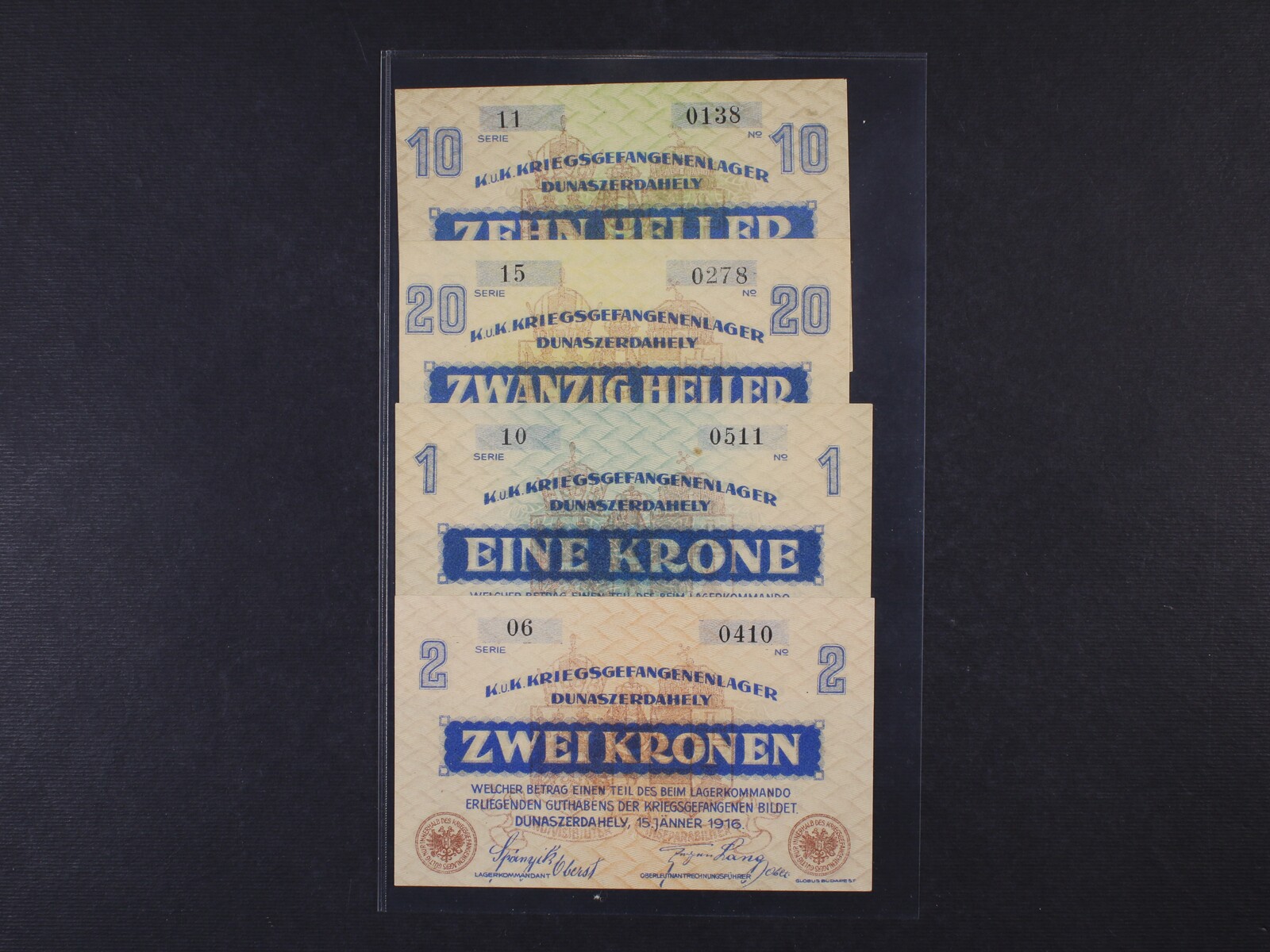 Dunaszerdahely (Dunajská Streda), 10 h, 20 h, 1 K, 2 K 15.1.1916 K.u.k. Kriegsgefangenenlager Dunaszerdahely, D.H. 304.2.2b, 3b, 4b, 5b, 4 kusy