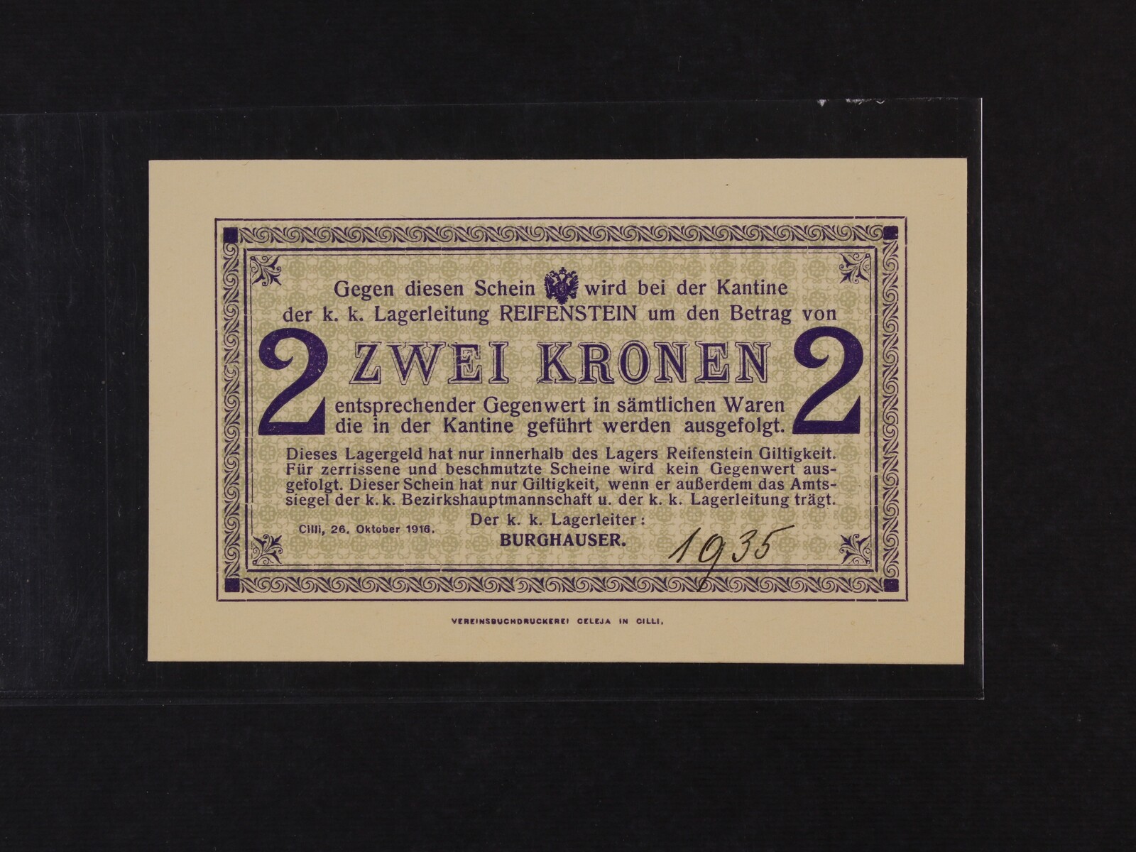 Reifenstein / Cilli (Slovinsko), 2 K 26.10.1916 série 1935, na R fialové táborové raz., Ri. 43.d