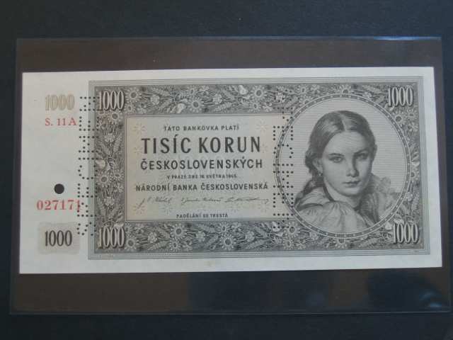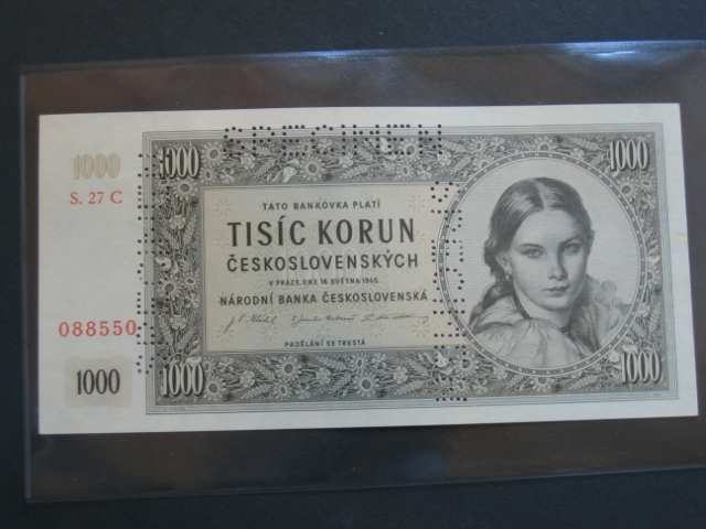 1000 Kčs 16.5.1945 série A, 2x svisle perf. SPECIMEN + perf. otvor, Pi. 74s, Ba. 78a