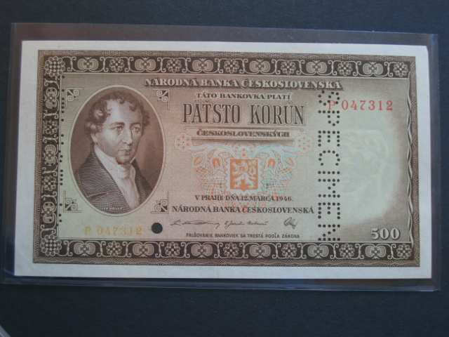 500 Kčs 12.3.1946 série P, 2x svisle SPECIMEN + otvor, Pi. 73s, Ba. 80a