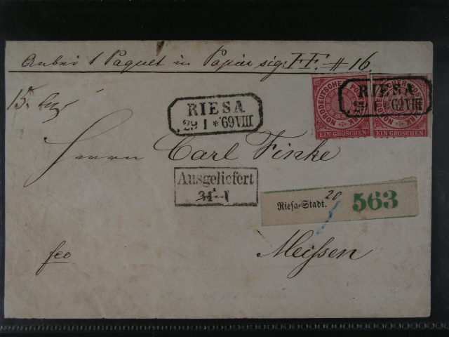 Nordpostbezirk - R-dopis do Misne frank. zn. Mi. c. 4 (2x) s ramec. raz. RIESA 29.1.69, prid. ramec. raz. AUSGELIEFERT + prich. raz.