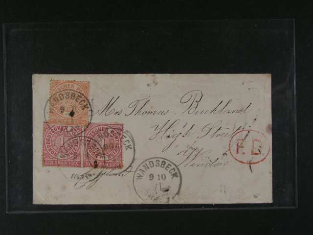 Nordpostbezirk - dopis maleho formatu do Anglie z r. 1871 frank. dvoupaskou zn. Mi. c. 4 a zn. c. 3, pod. raz. WANDSBECK 9.10.11 + ovalne cervene raz. P.D., prich. raz., dekorativni