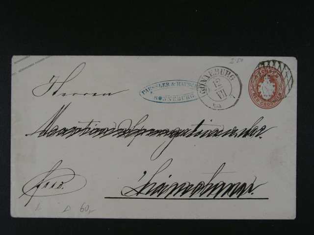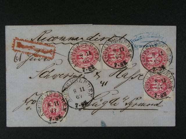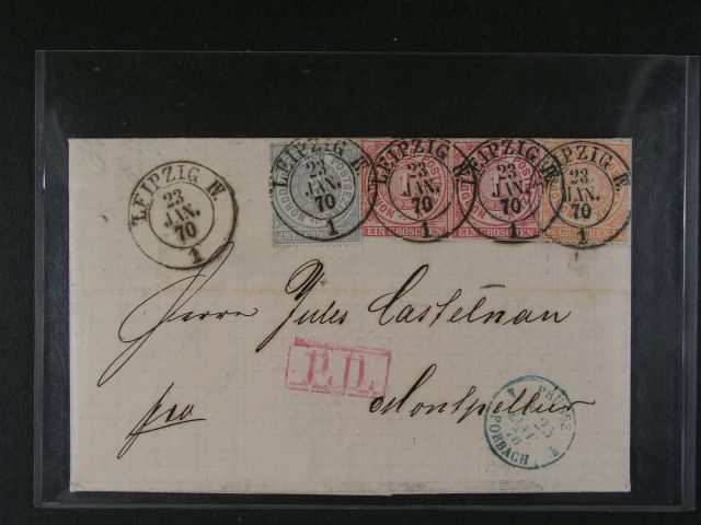 Nordpostbezirk - skl. dopis z r. 1870 do Francie frank. zn. Mi. c. 15, 16 (2x), 17, pod. raz. LEIPZIG 23.JAN.1870, prid. ramec. raz. P.D., pr?ch. a prich. raz., dekorativni, dobra kvalita