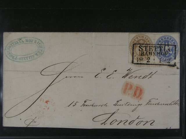 Prusko - firemni skl. dopis z r. 1863 do Londyna frank. zn. Mi. c. 17, 18, s ramec. raz. STETTIN BAHNHOF 19.2., pridavne cervene raz. P.D. a cervene prich. raz. LONDON