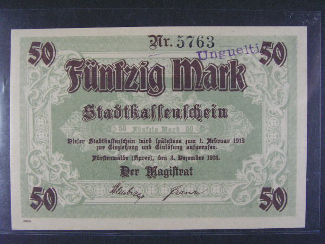 798 Fürstenwald, 50 Mk 3.11.1918 Der Magistrat, fialove raz. Ungueltig 250