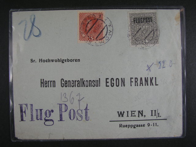 R-let. dopis do Prahy frank. na predni strane zn. Mi. c. 425, 427 - 32, na zadni strane zn. Mi. c. 433 - 41, velmi dekorativni, pod. raz. WIEN 88 20.6.23, pruch. raz. WIEN FLUGPOST, prich. raz. PRAHA LETISTE, min. 200 EUR