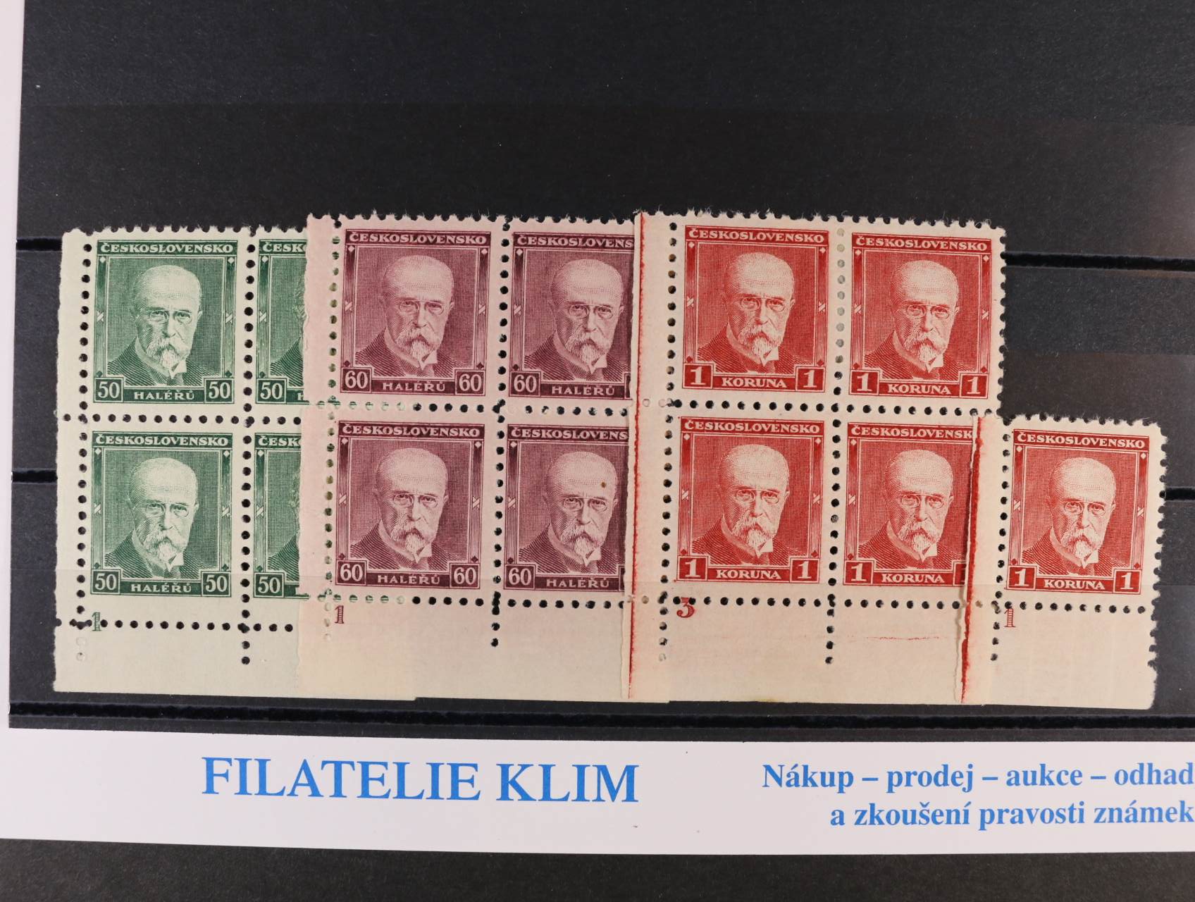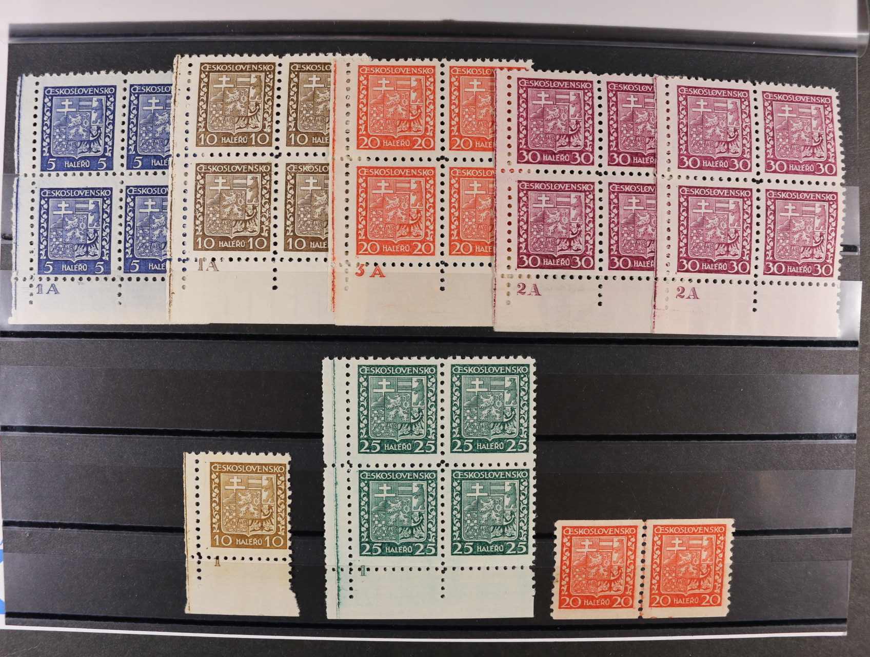 zn. č. 248 - 50, 52 - rohové čtyřbloky s DZ, zn. 249 - levý spodní roh. kus s DZ 1 v barvě olivově hnědé, zn. 251 - levý spodní roh. čtyřblok s DZ 1 a dvojitou svislou perforací na levém okraji, zn. 250x ve vodorovné dvoupásce s DZ 2A (nálepka), kat. cena cca 600 Kč